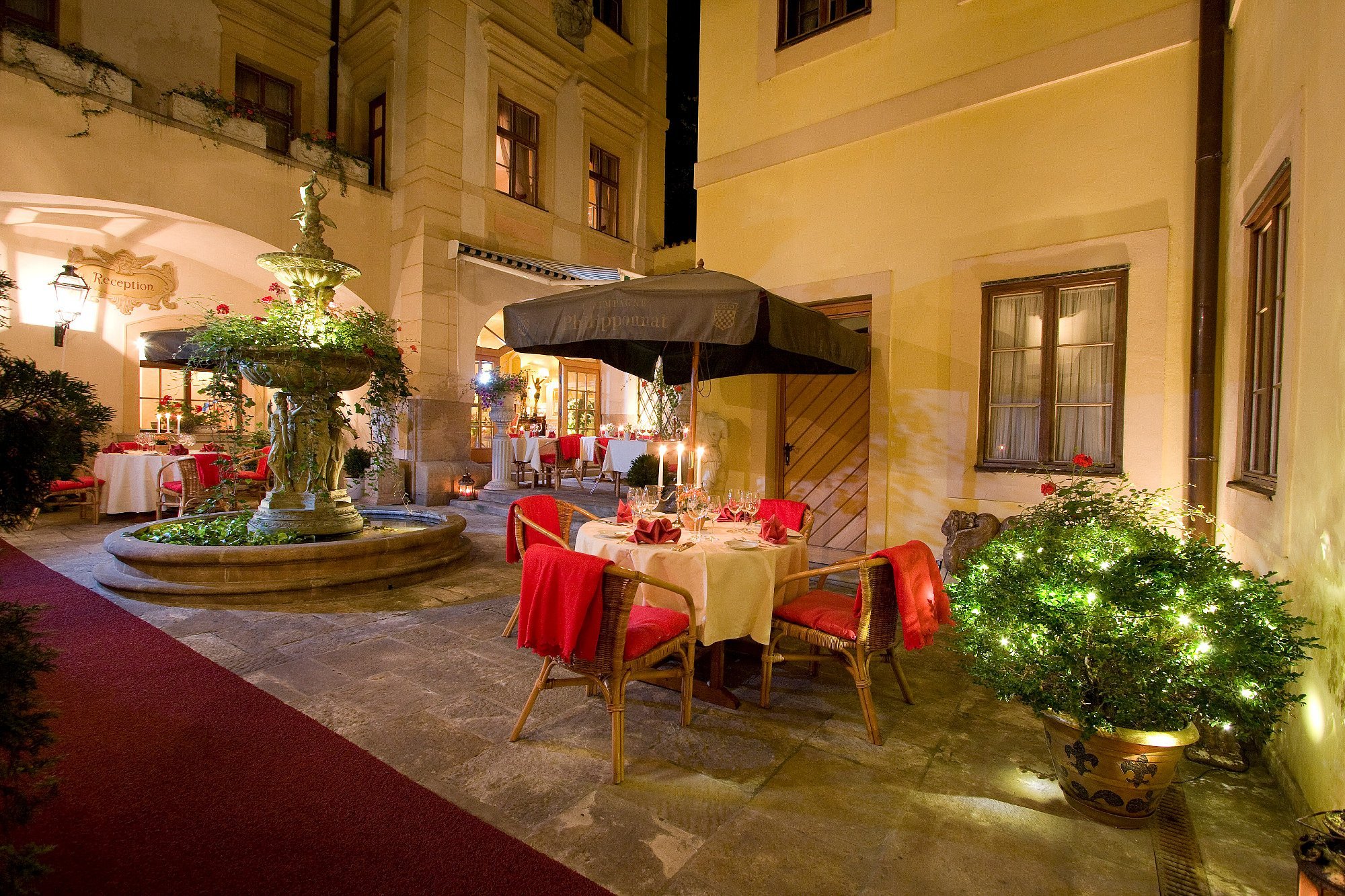 A glass of Moravian wine in the courtyard, surrounded by warm stone and flickering lanterns.