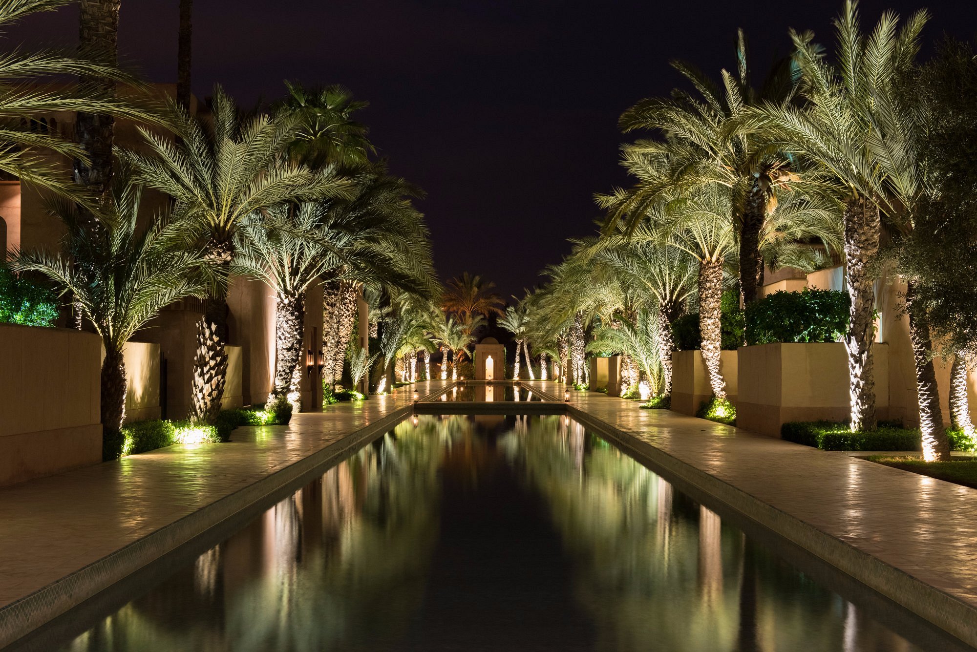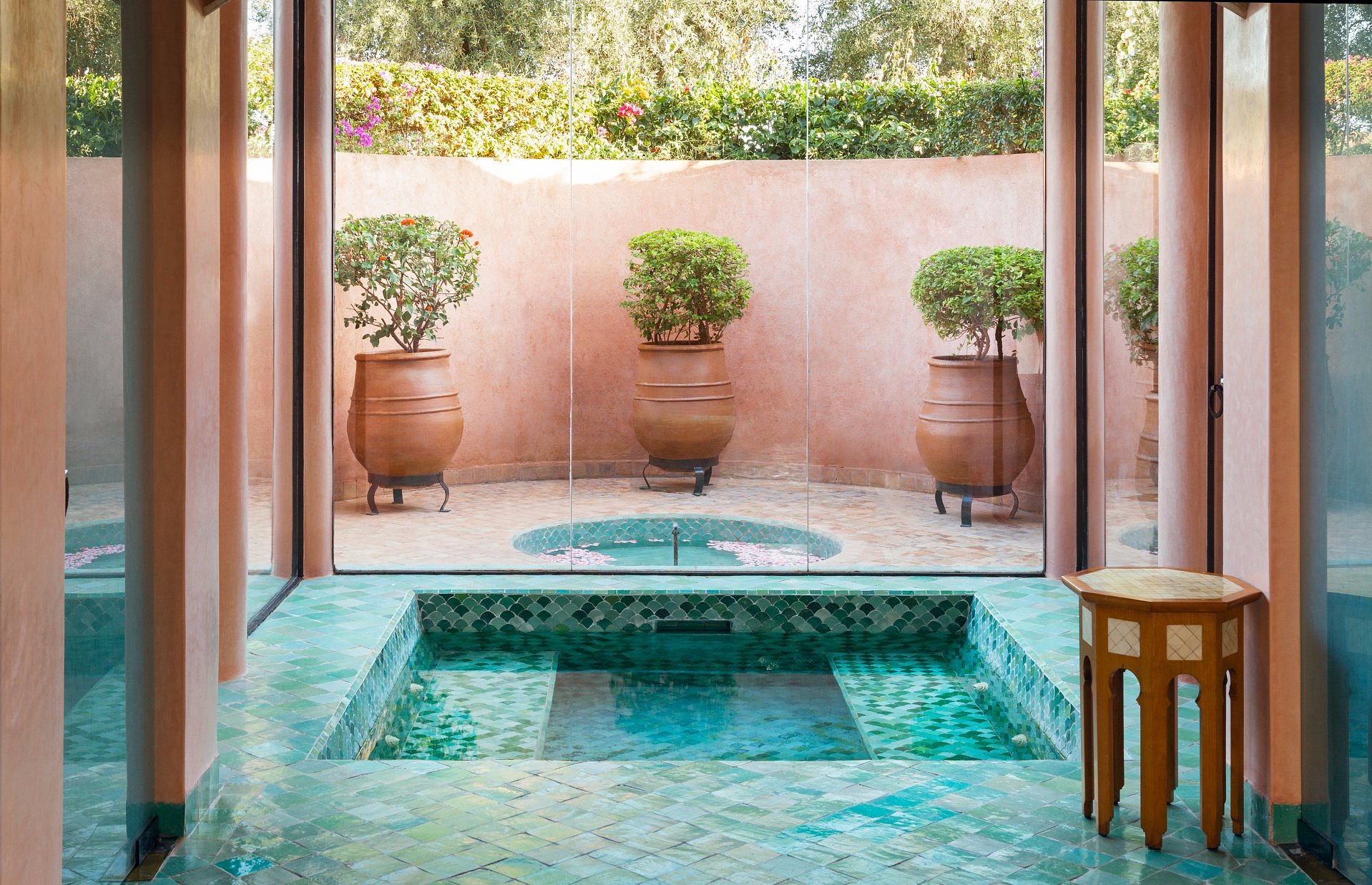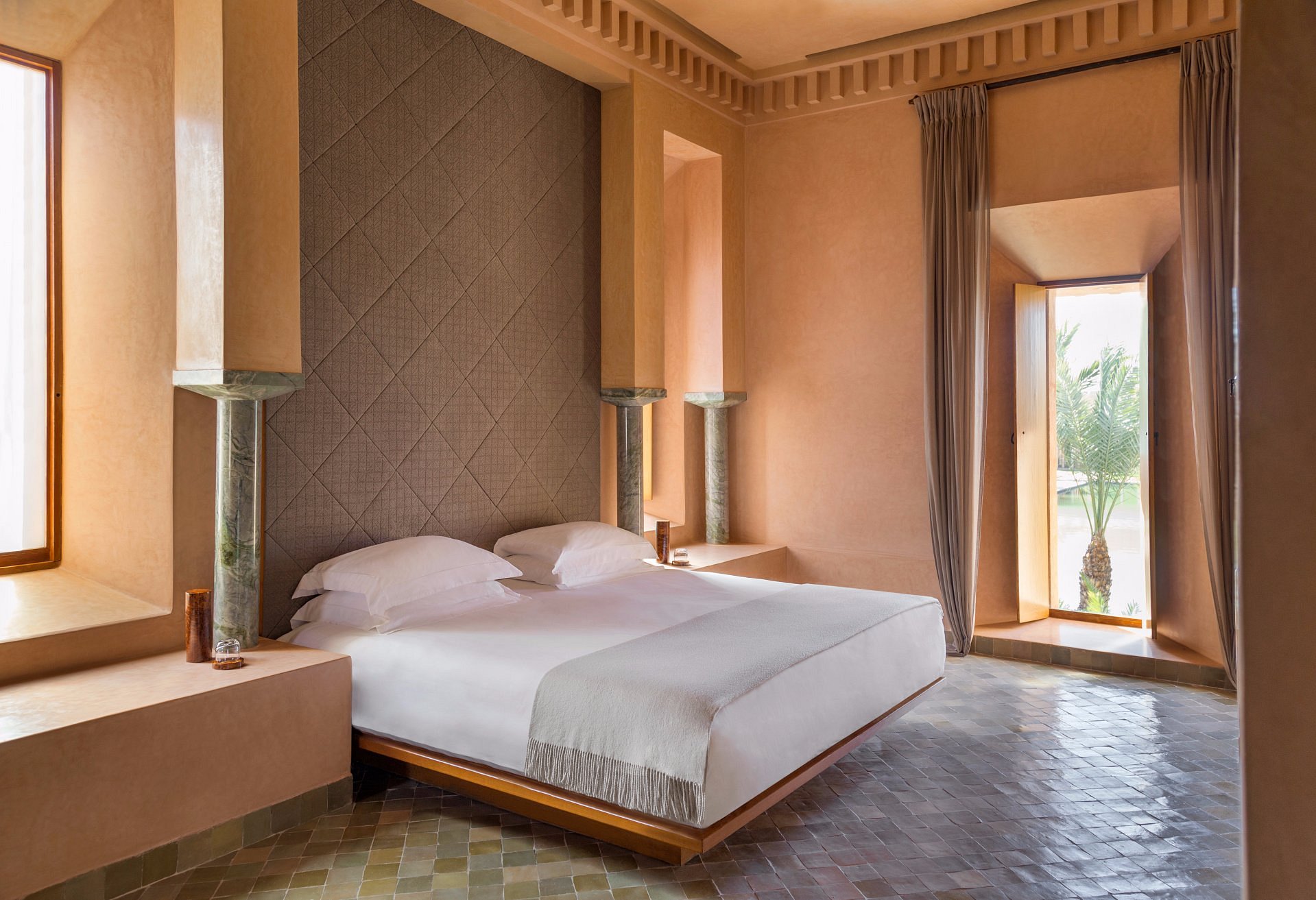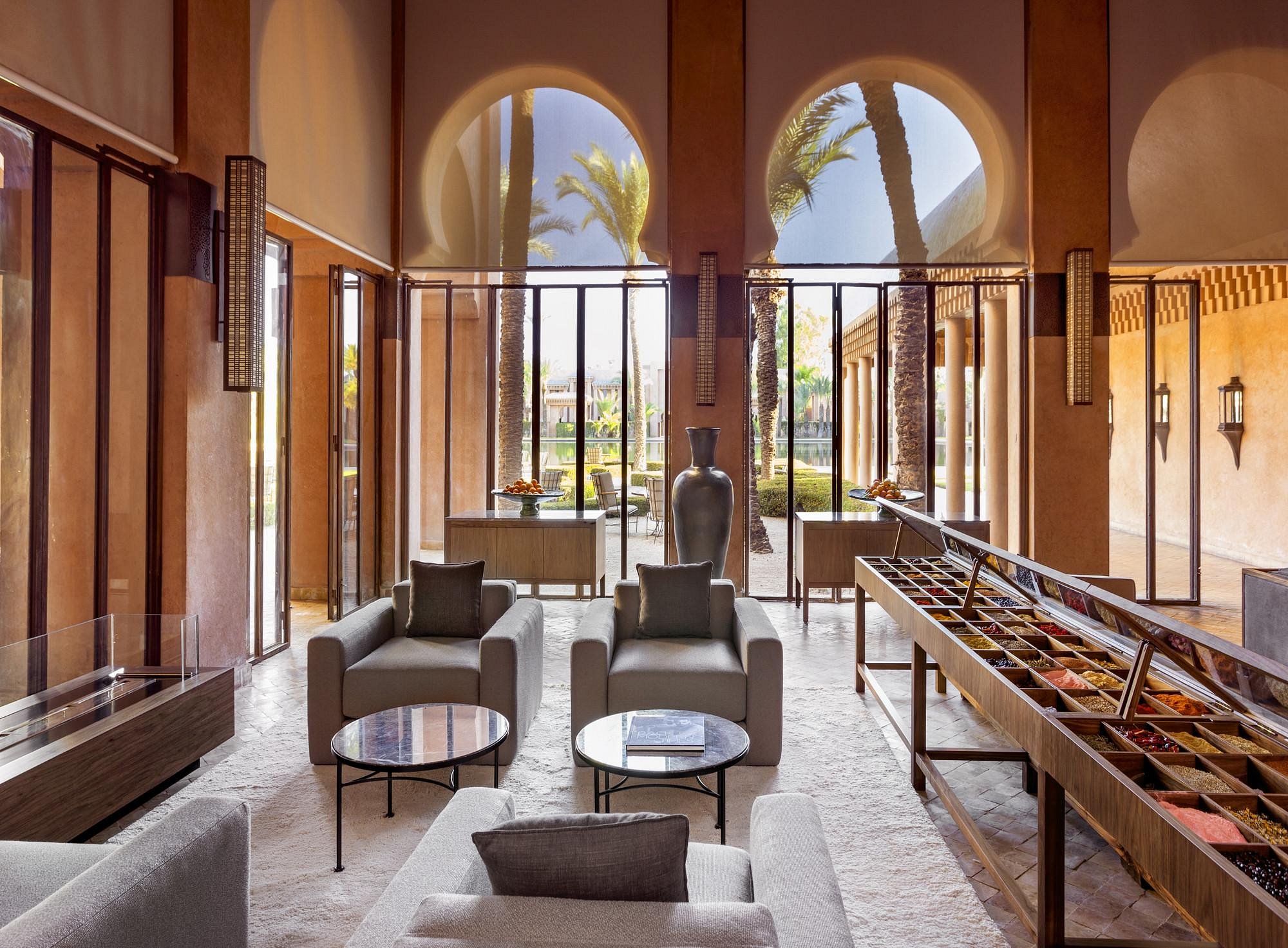 Here, Moorish arches frame a vast reflecting pool, pathways are paved in pale stone, and suites open to private courtyards and heated pools. It’s serenity made visible—where time slows to the rhythm of fountains and distant birdsong.