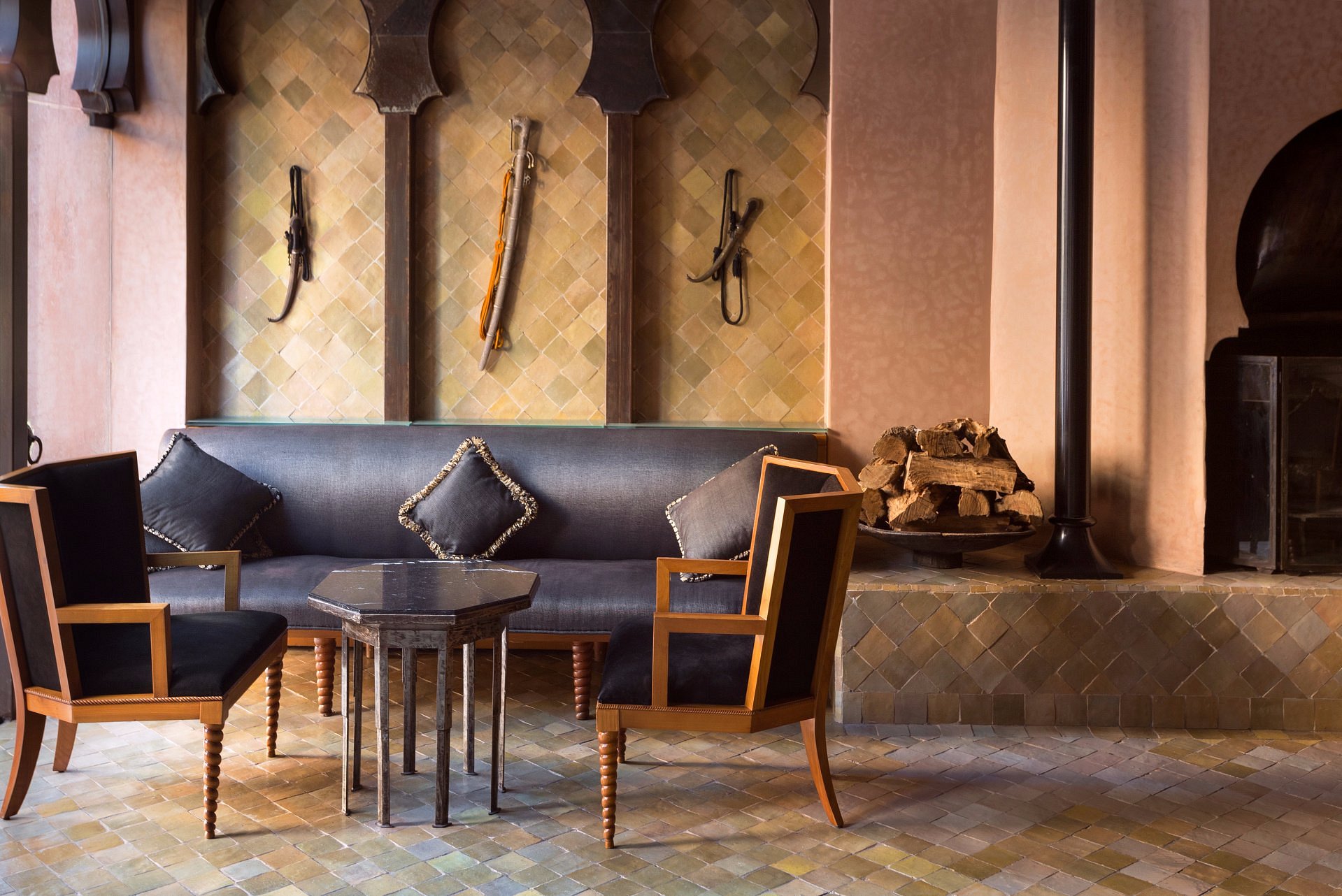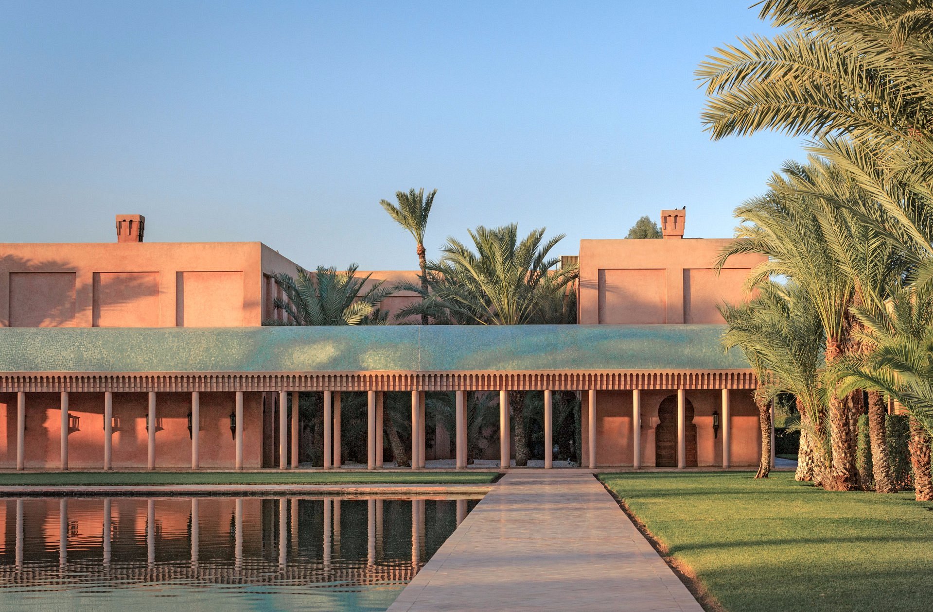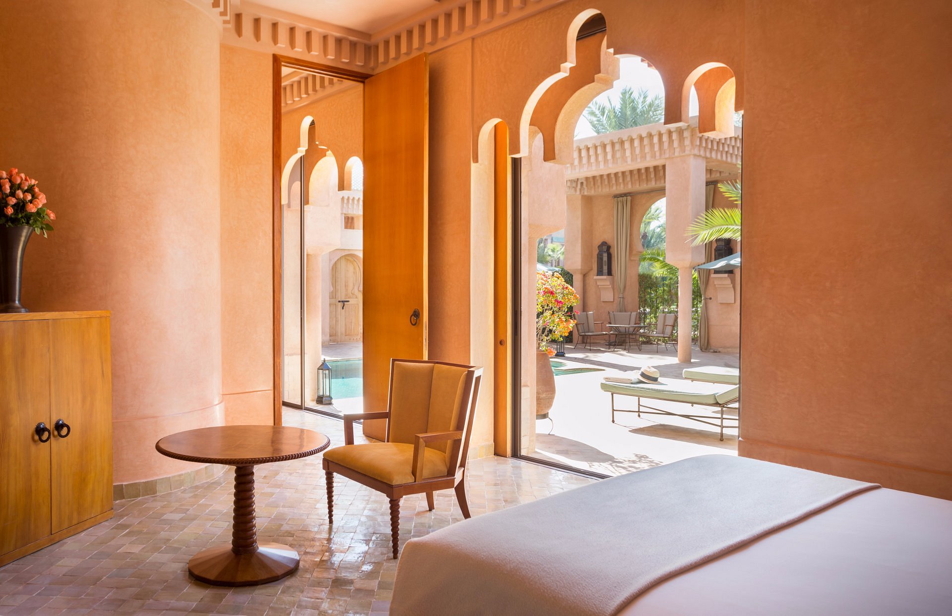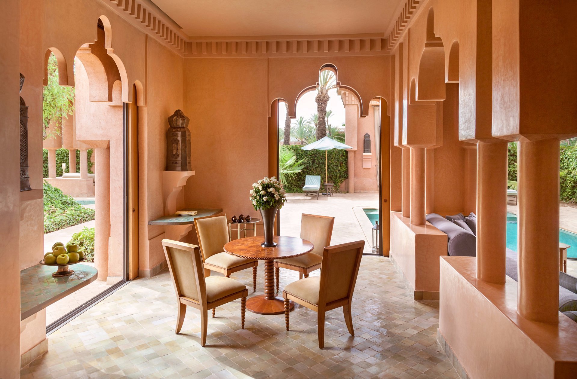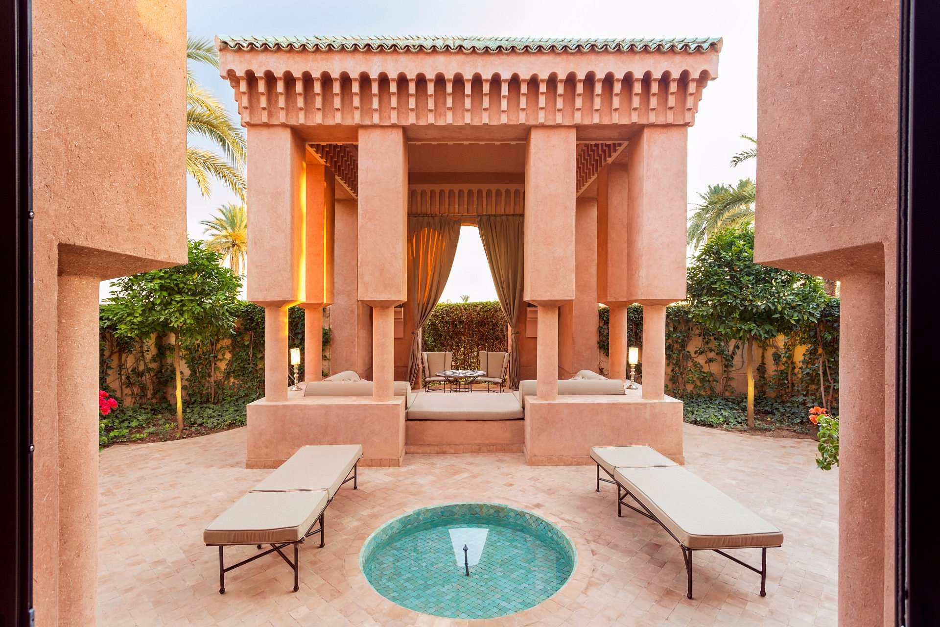 Mint tea and warm msemen arrive to your courtyard as first light paints the Atlas foothills. The reflecting pool lies perfectly still; doves coo in the palms.