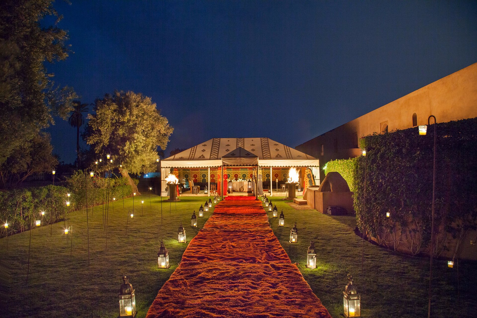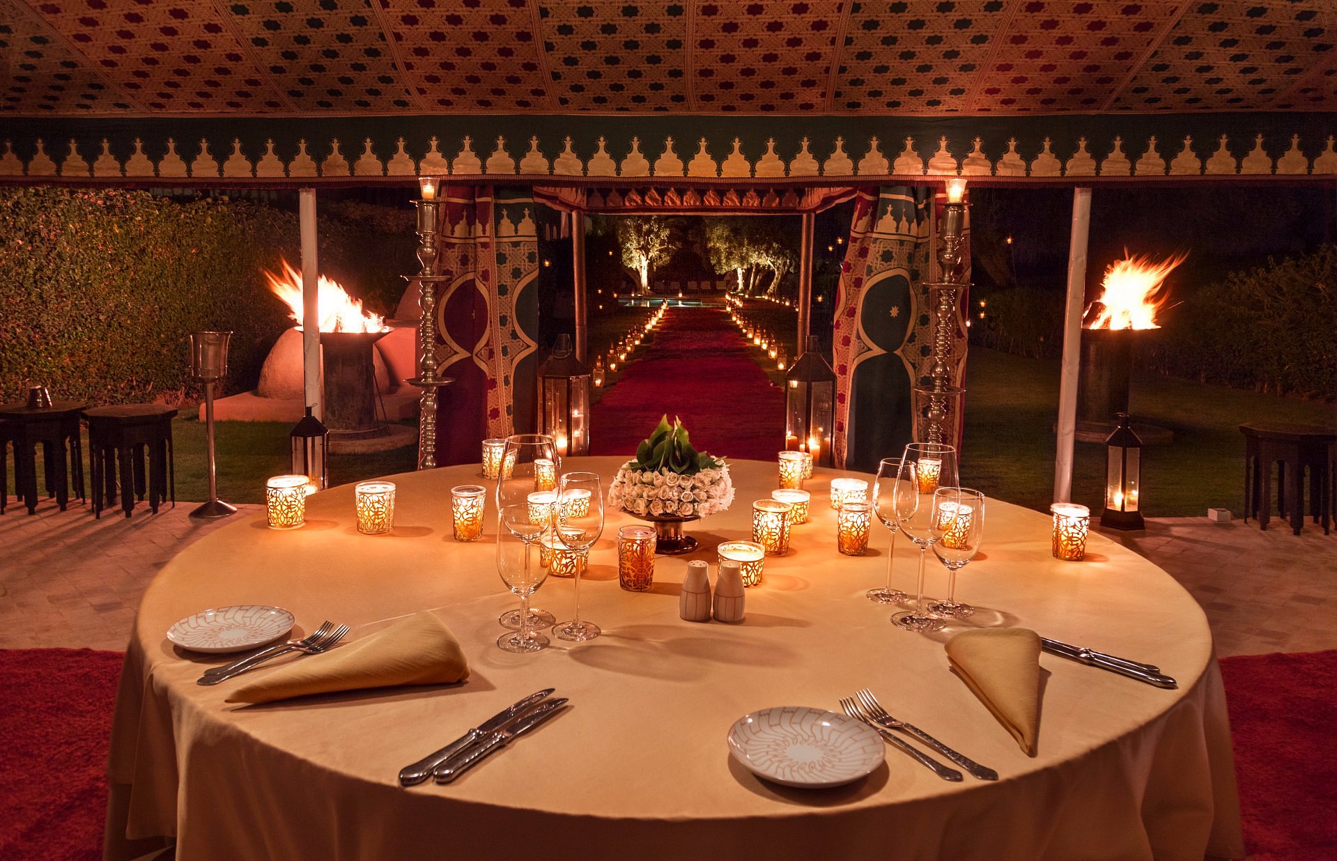 Return through perfumed gardens to your pavilion. A brazier glows, the fountain murmurs, and Marrakech breathes softly beyond the walls.