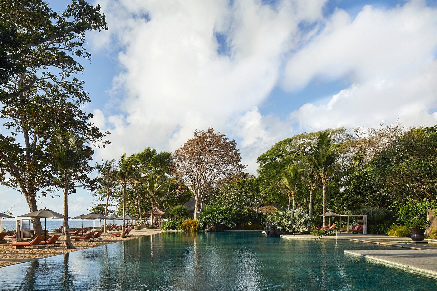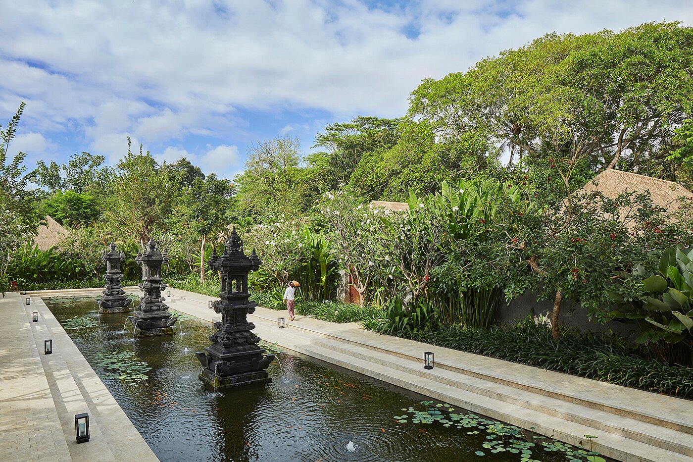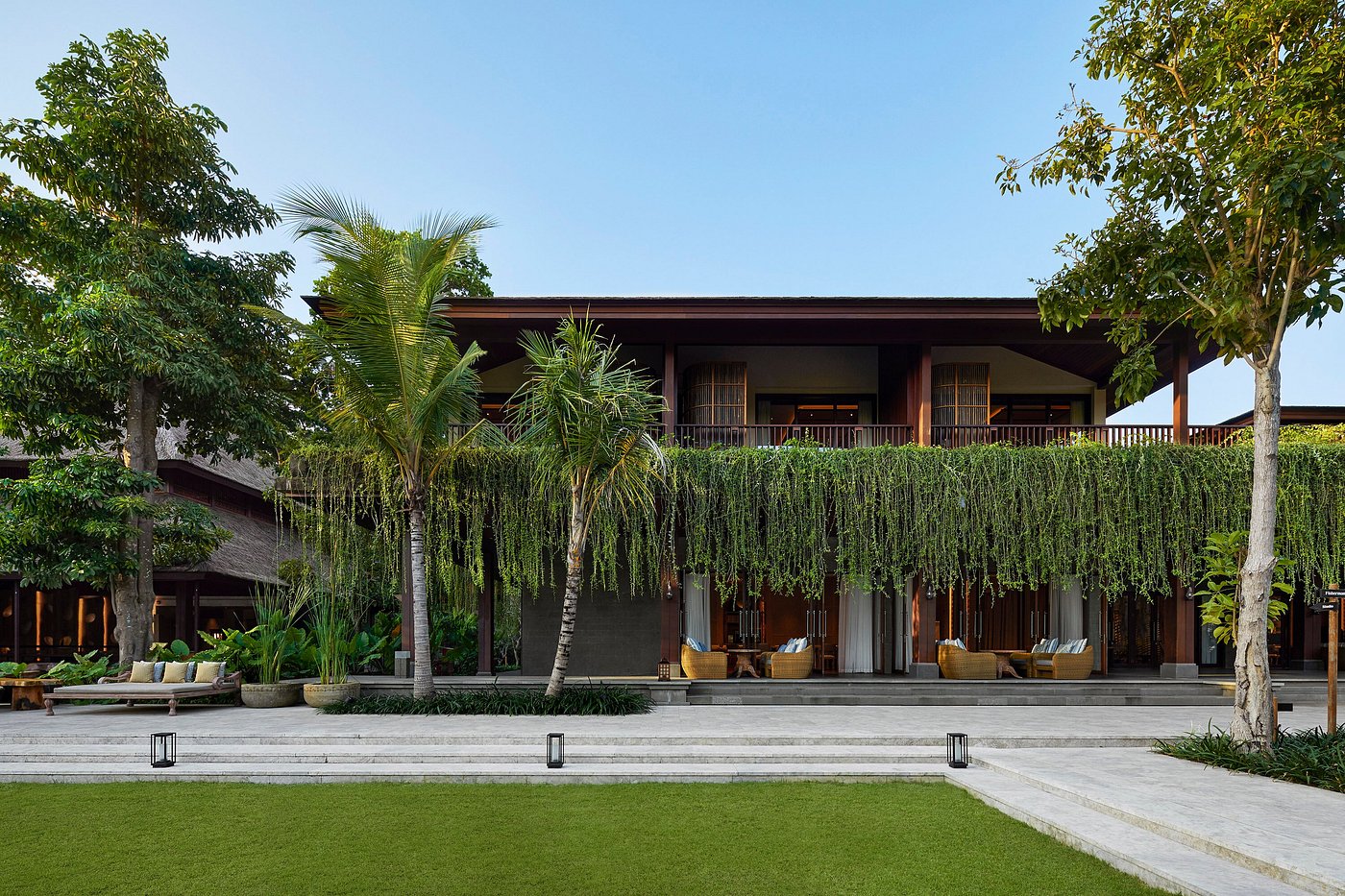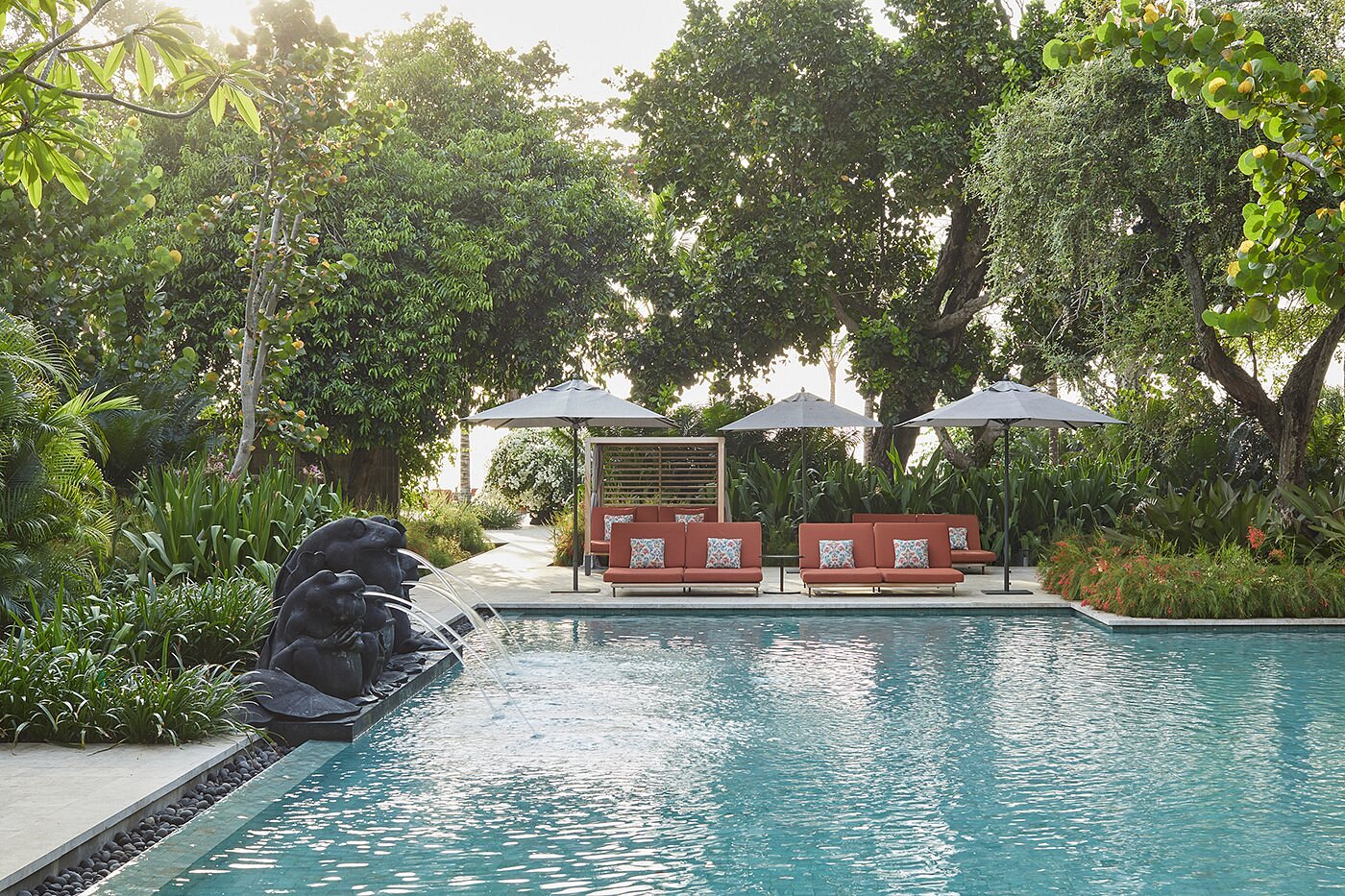 With 149 rooms and suites spread across low-rise pavilions and gardens, the atmosphere feels open and easy — shaded walkways, water features, and soft light filtering through palms.
