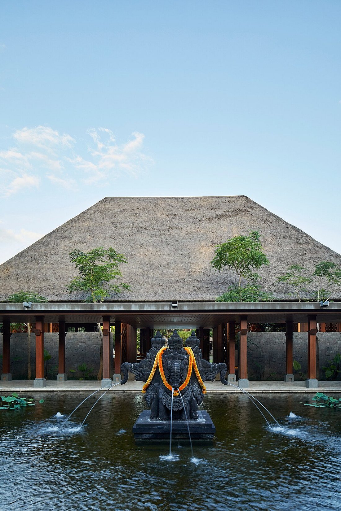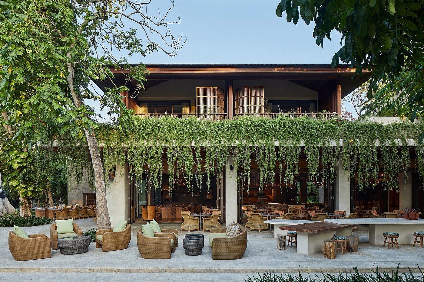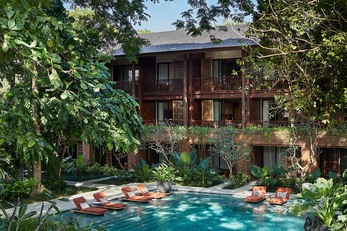 With 149 rooms and suites spread across low-rise pavilions and gardens, the atmosphere feels open and easy — shaded walkways, water features, and soft light filtering through palms.