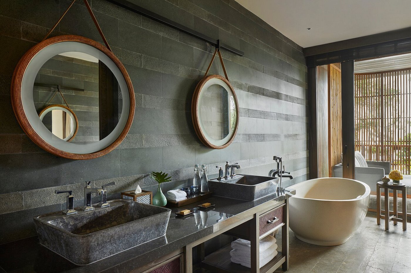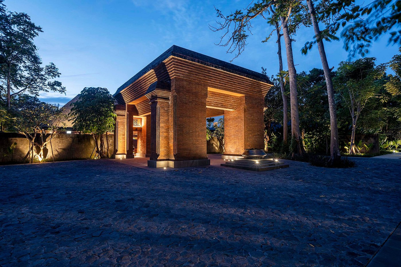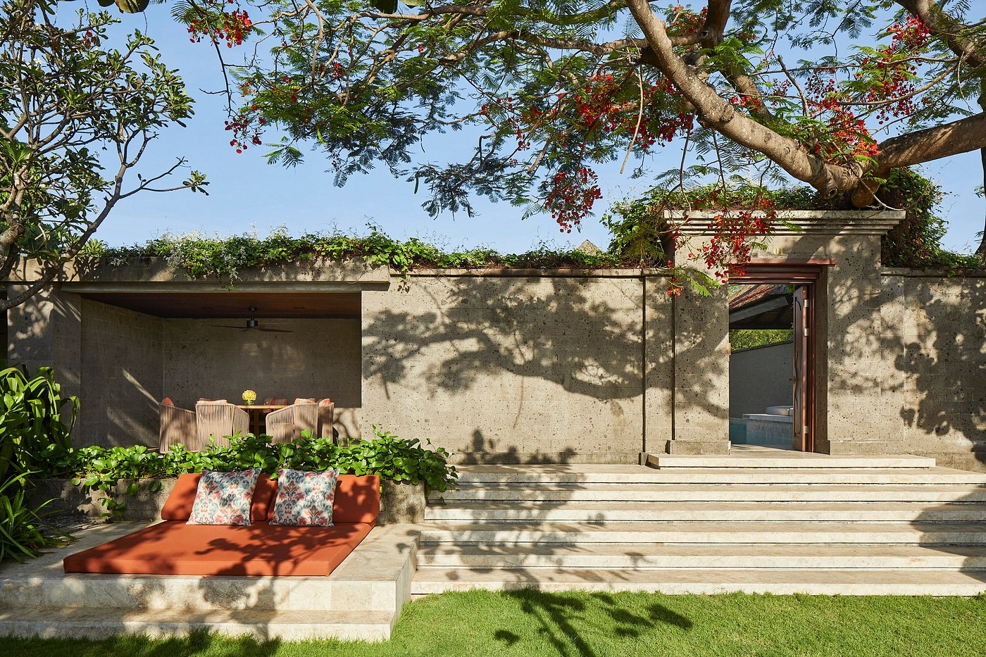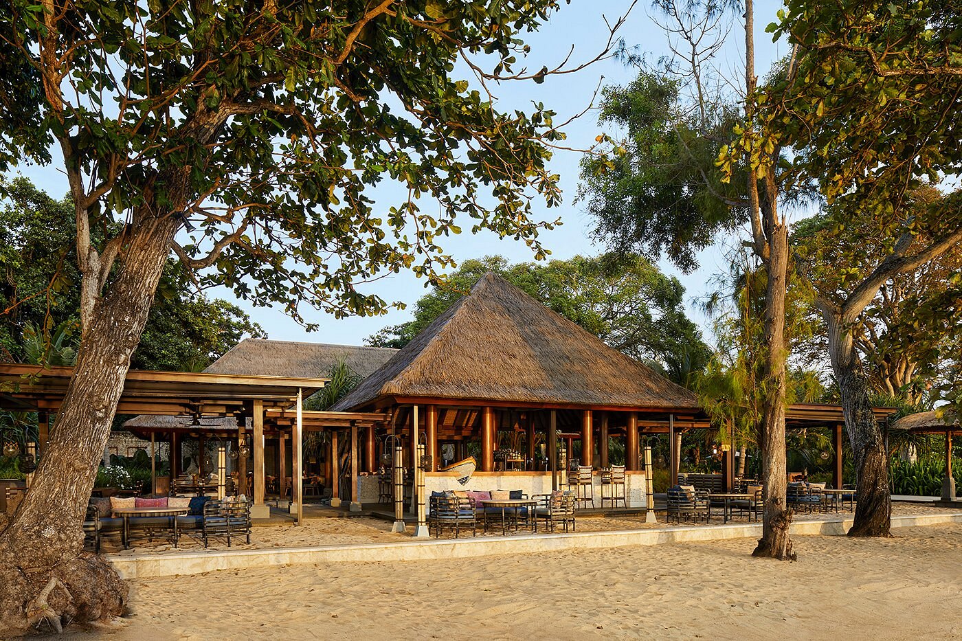 With 149 rooms and suites spread across low-rise pavilions and gardens, the atmosphere feels open and easy — shaded walkways, water features, and soft light filtering through palms.