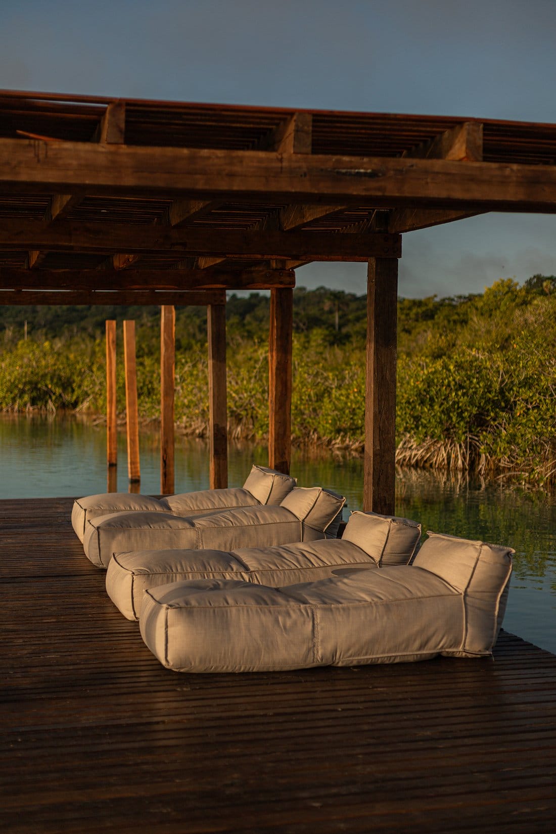 Golden light pours through the trees. Sip a smoky mezcal at the bar as the water mirrors the sky. Dinner leans local—achiote, plantain, and fresh-caught fish.
