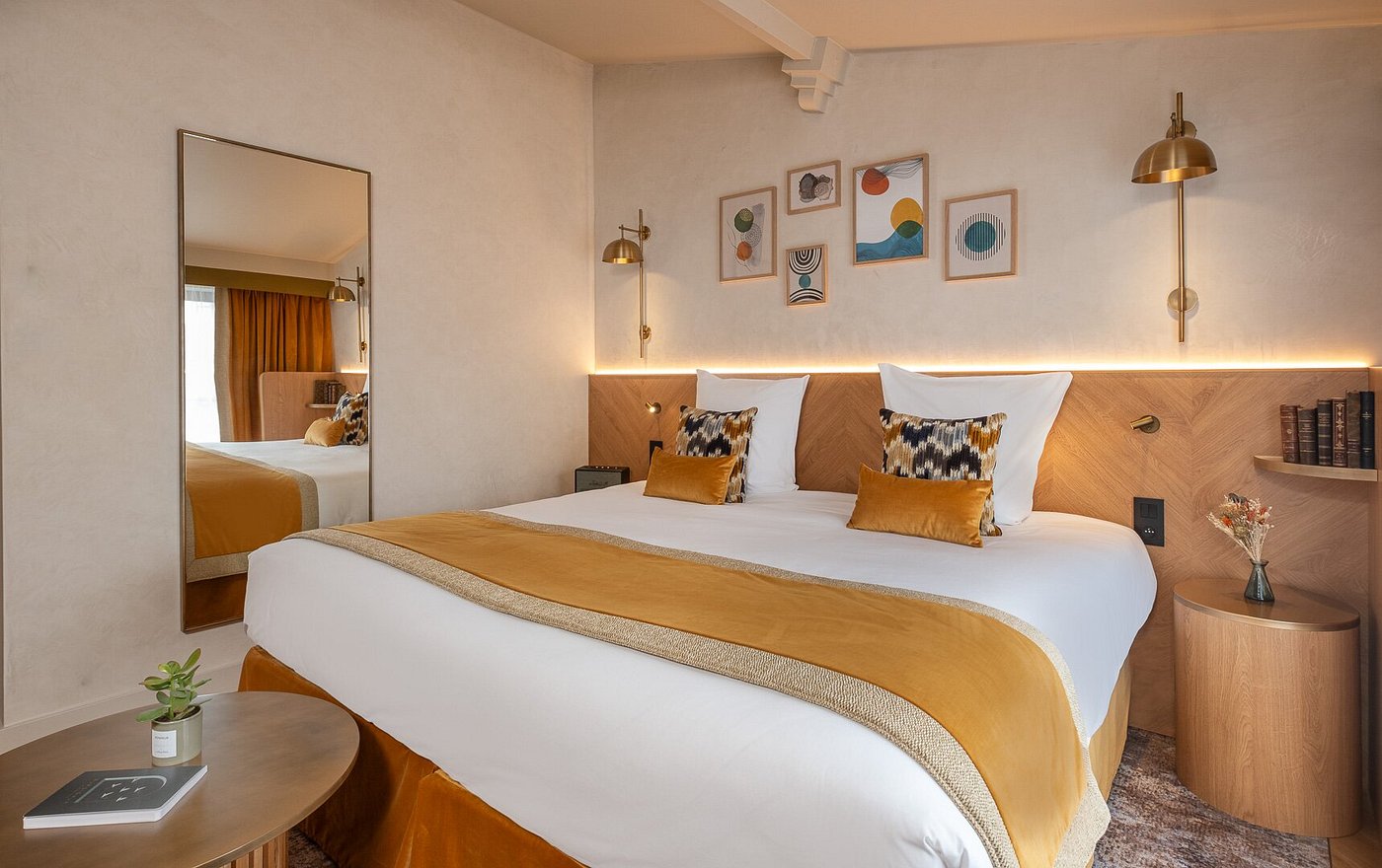 In your room, minimalist lines and warm textures offer peace after the city’s energy—contemporary Bordeaux at its most comfortable.