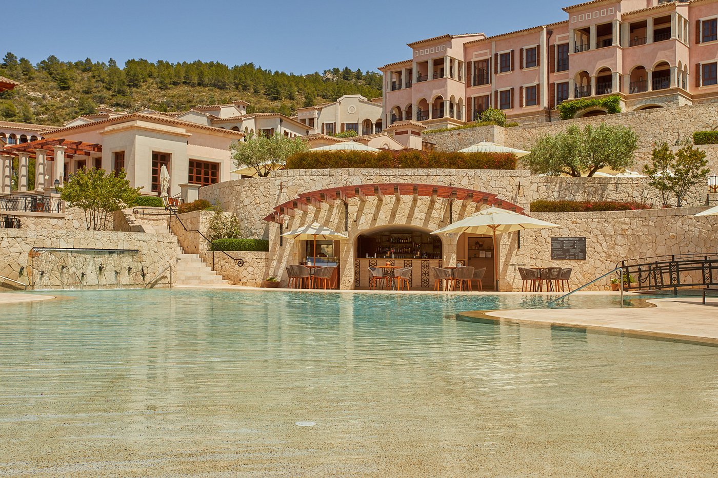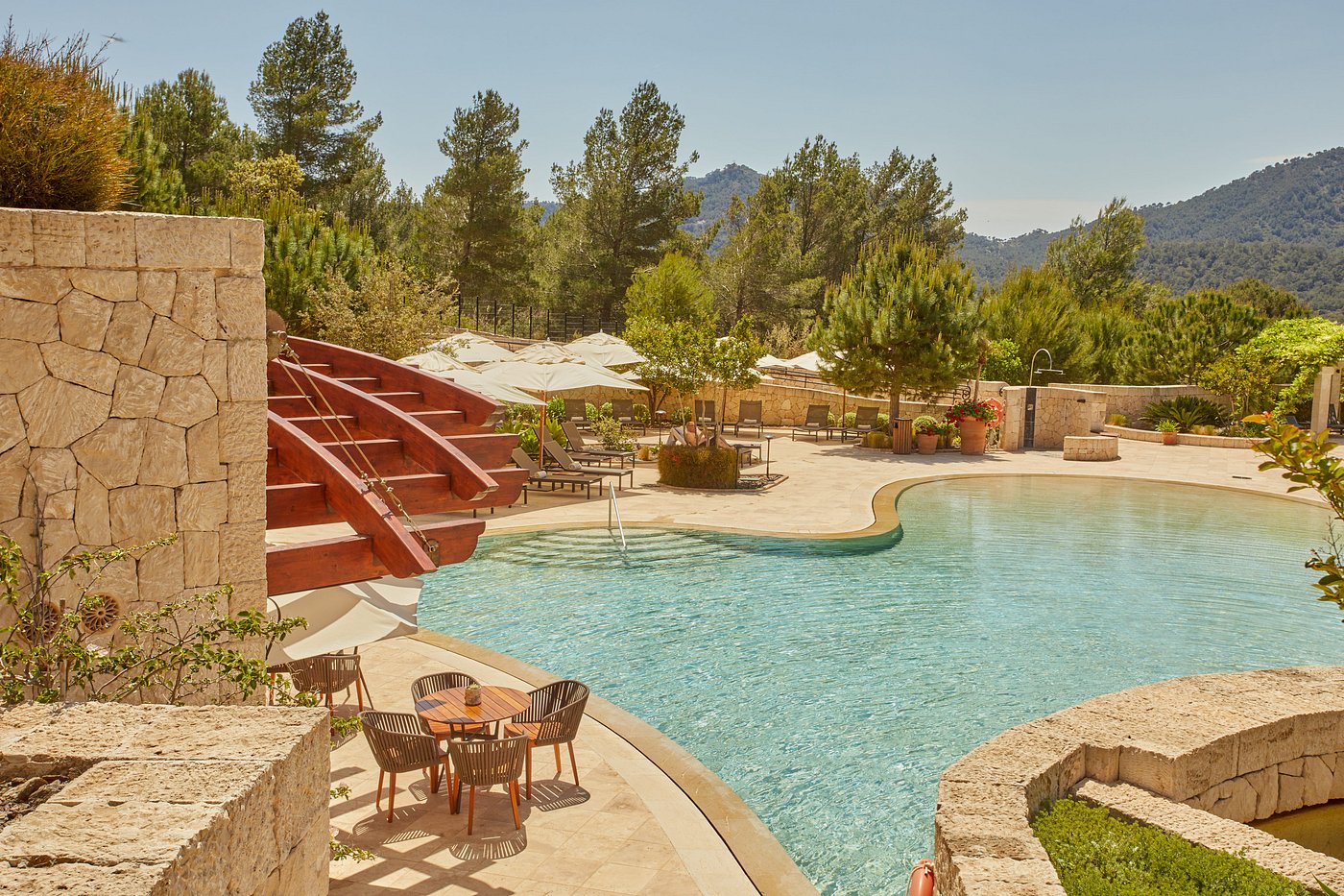 You wake to the rustle of pines and bells from a distant church. Breakfast arrives with ensaïmada still warm, figs, and island honey. A short walk leads to the upper pool, where swallows cut patterns over the water.
