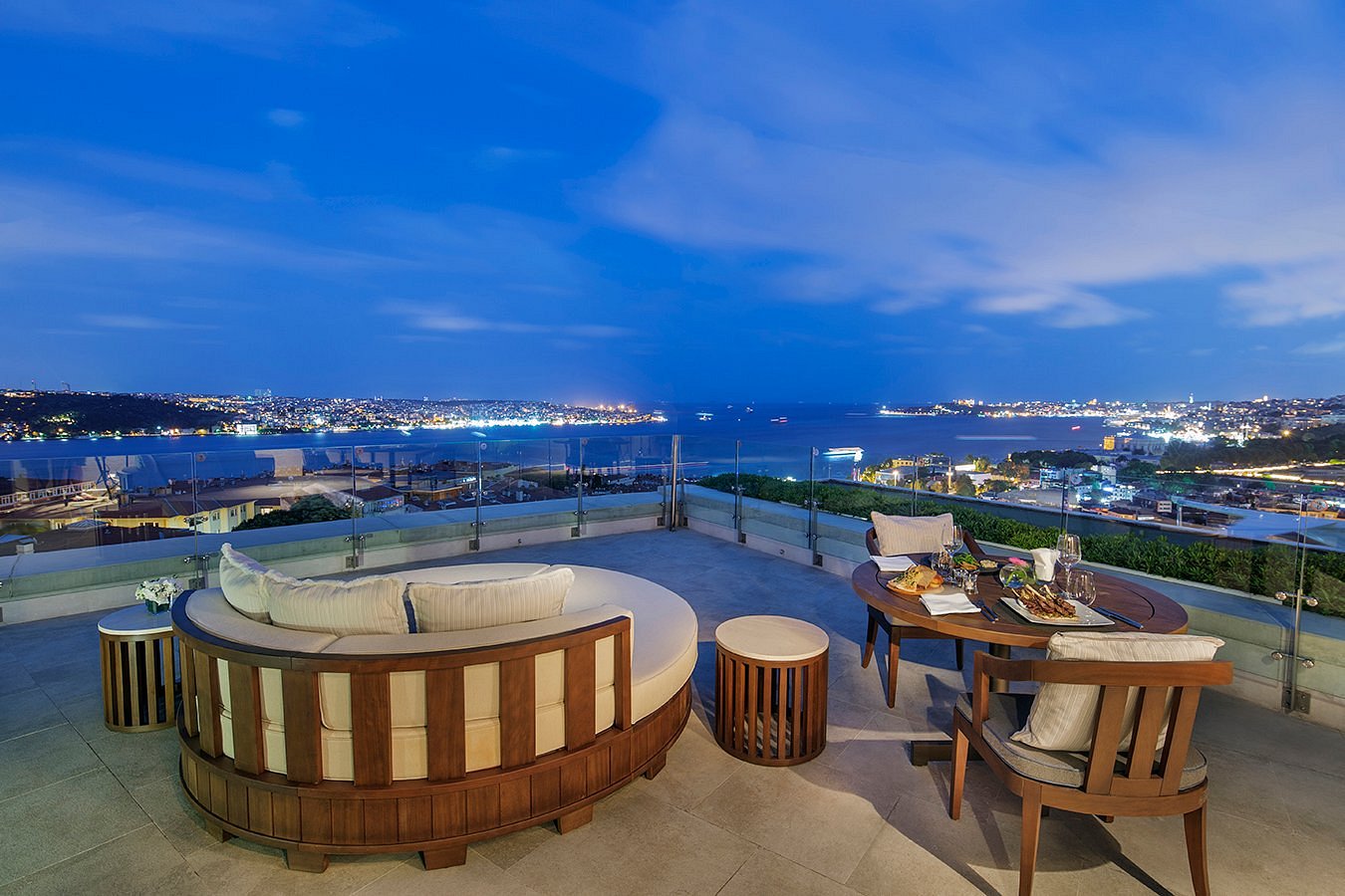 Return to a calm, spacious room—windows framing the glow of Istanbul’s night skyline.