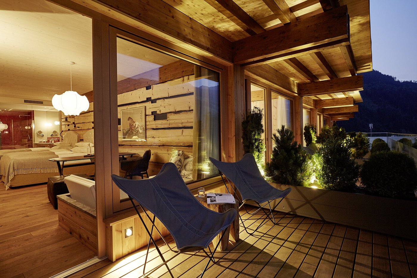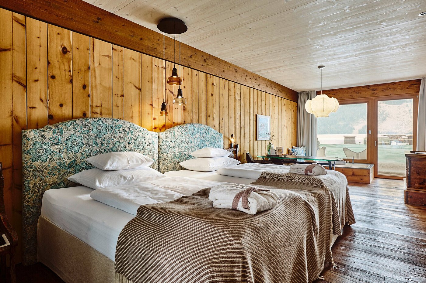 Your room settles into deep quiet, with natural textures and soft lighting creating a calming Alpine cocoon.