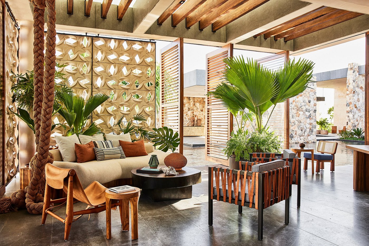 Style: Resort, Tropical—limestone, warm woods, woven fibers, and Caribbean blues