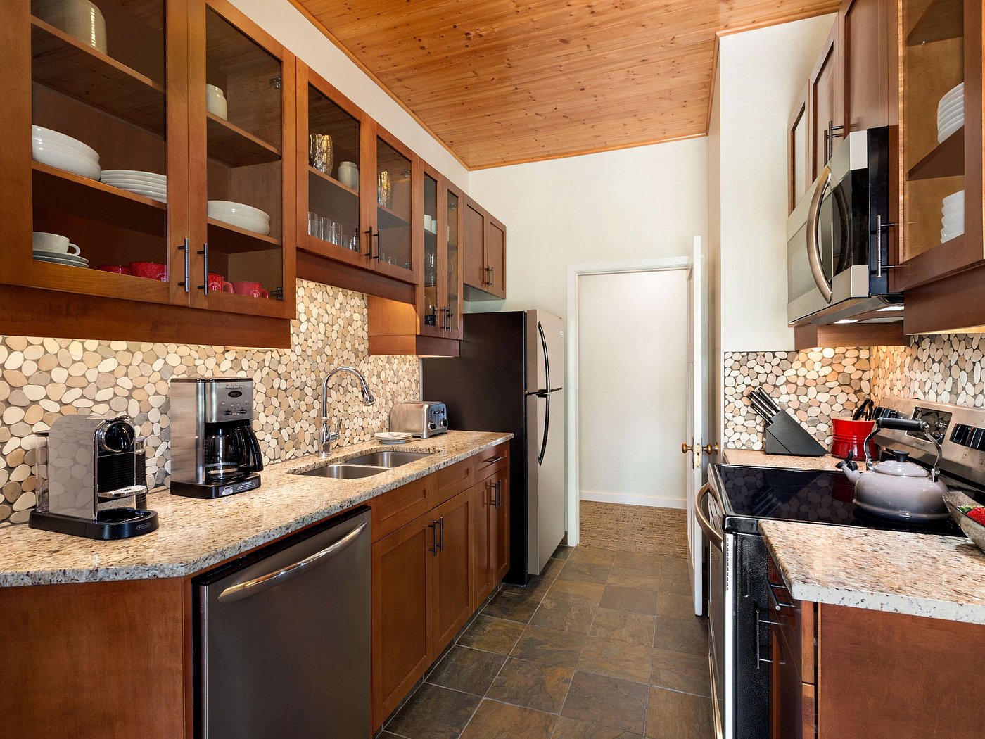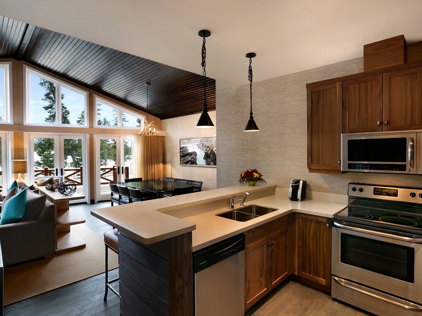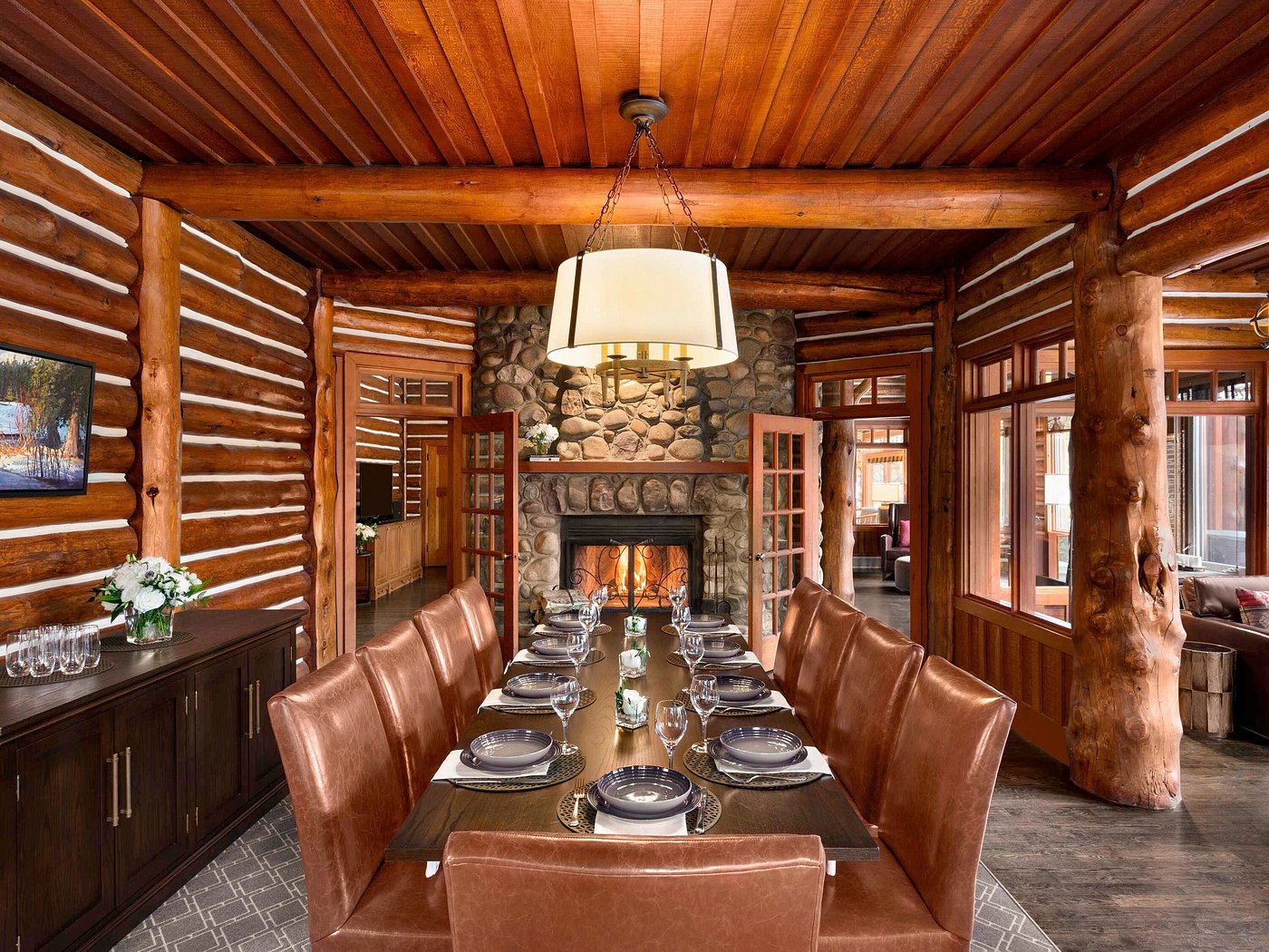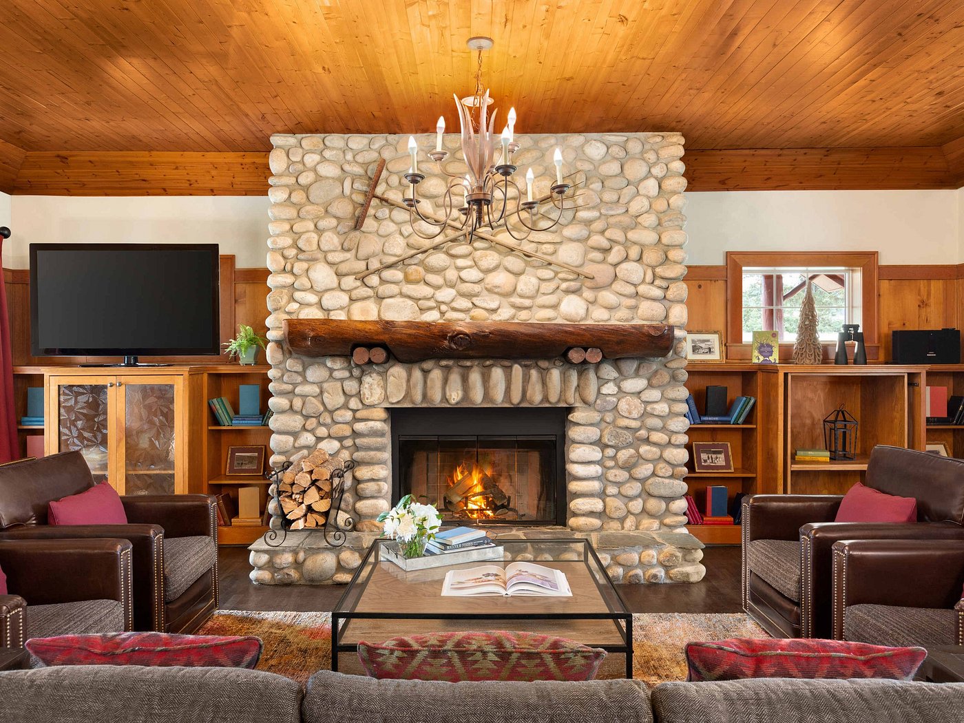 The landscape shapes the hours. Walks along the shoreline, time on nearby trails, or long pauses watching light shift across the water. Indoors, lodge spaces feel warm and unhurried, framed by wood and stone.