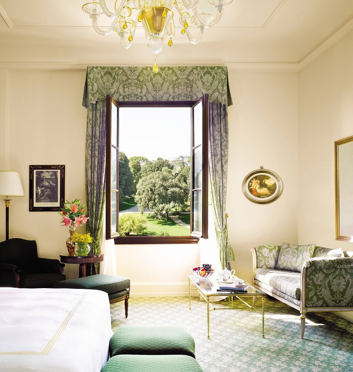 Breakfast is served with garden views — espresso, fresh pastries, fruit — followed by a quiet walk among statues, fountains, and centuries-old trees.