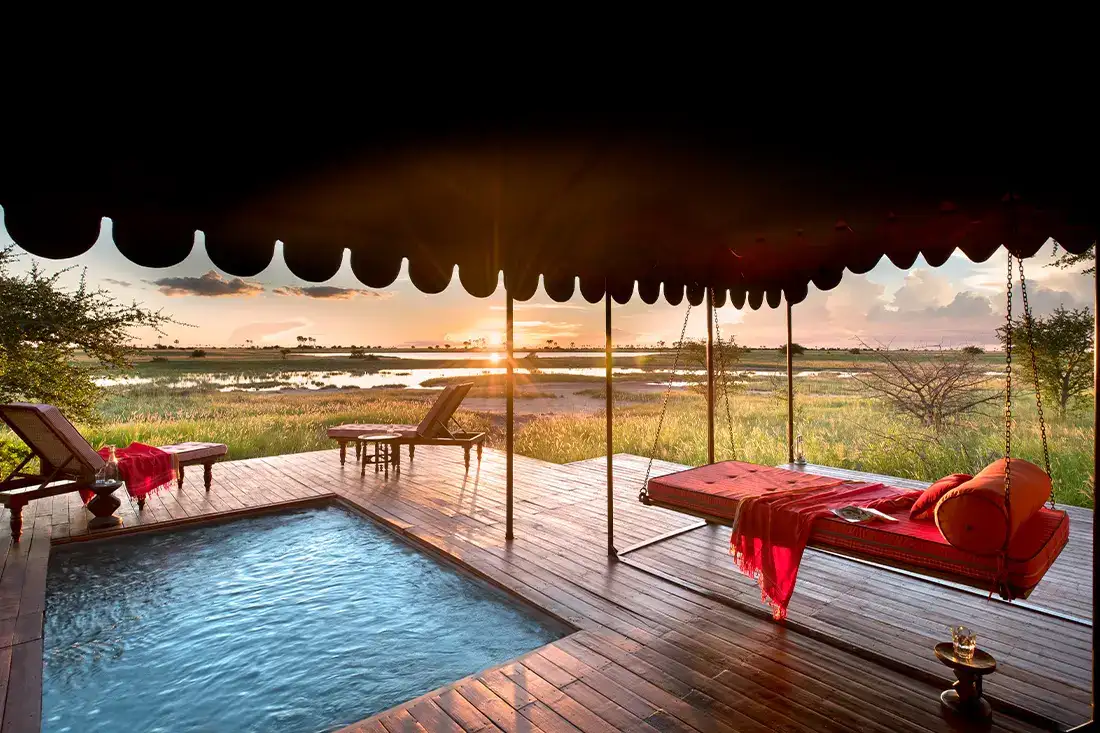 At dusk, around the fire—with legs warmed by gin spiked with African chilies—you return to canvas, where your plunge pool reflects a sky deepening into wild indigo.