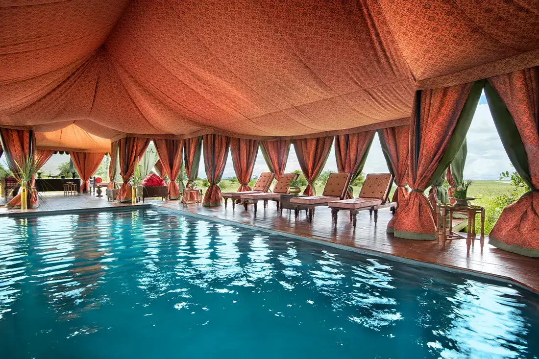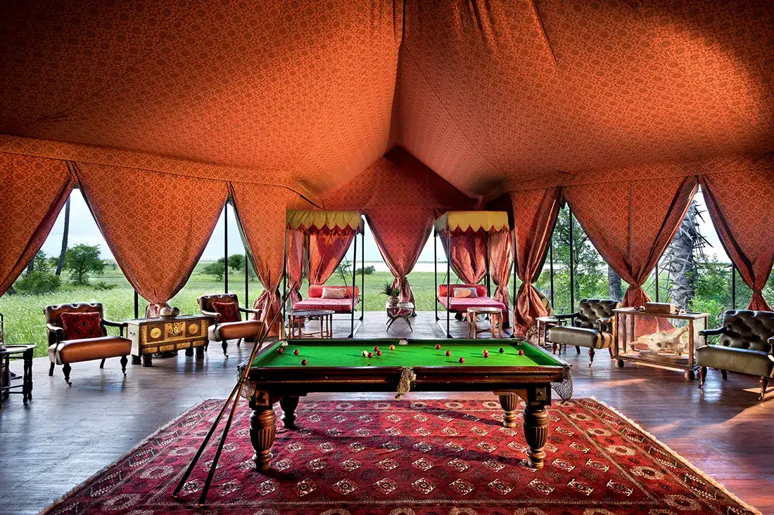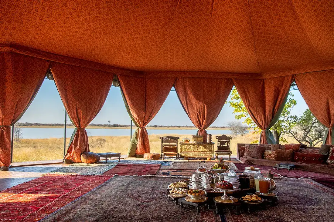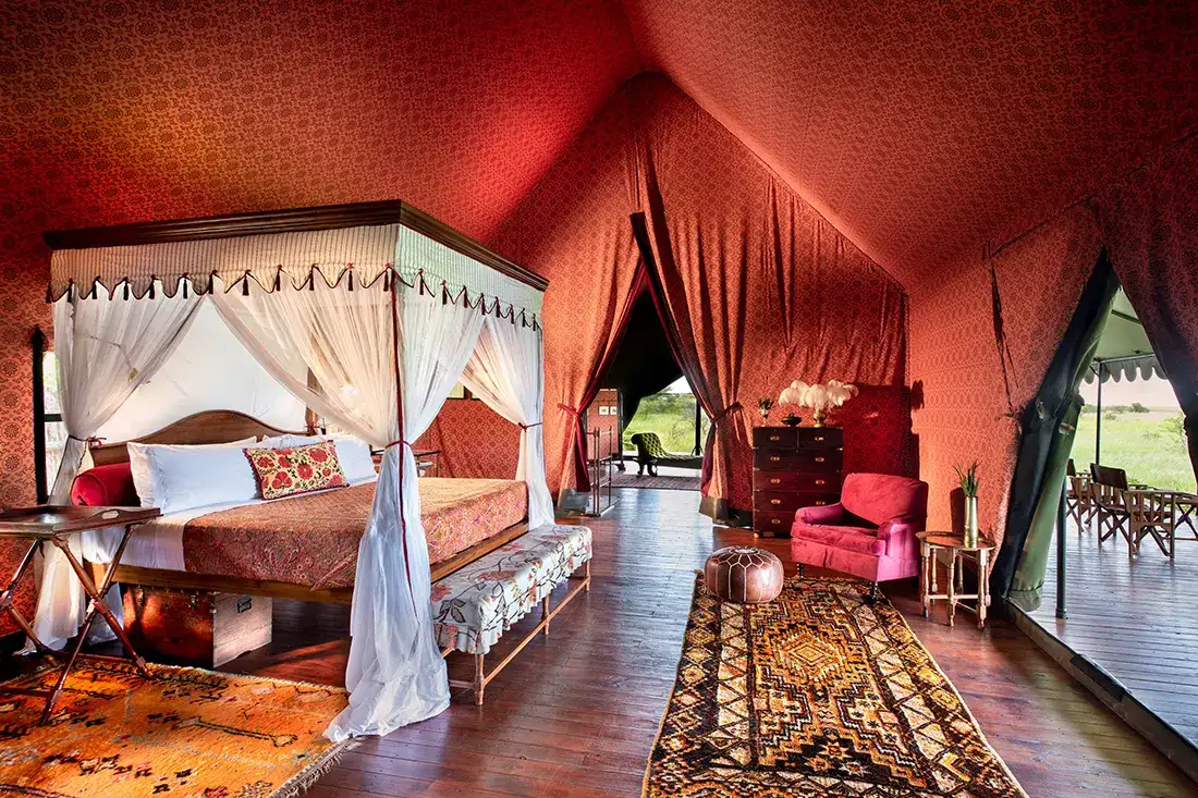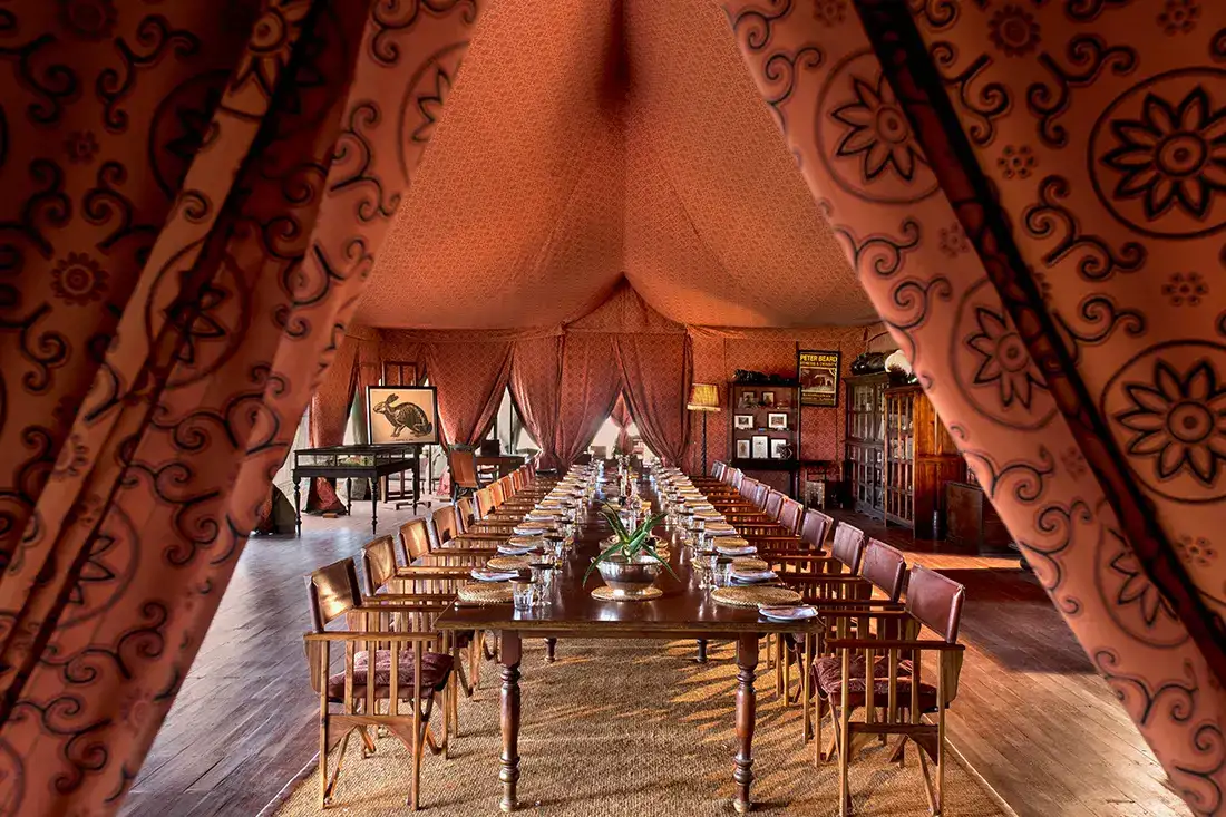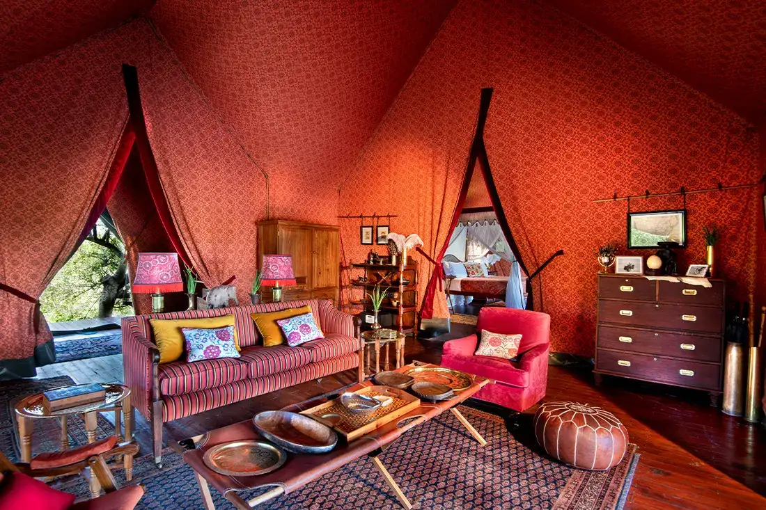 - Vast safari‑style tents (270 m² each), decked with campaign‑era antiques and global rugs