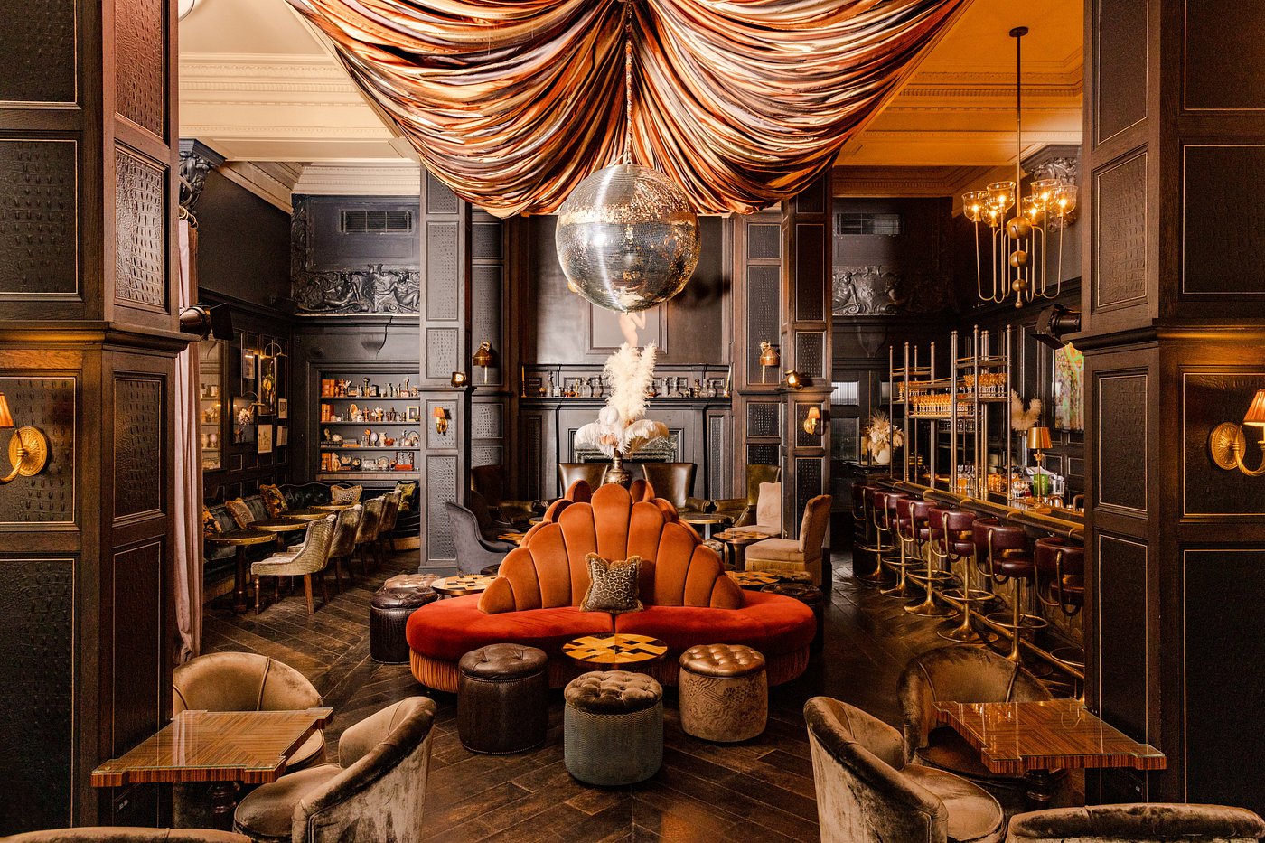Crystal chandeliers hang above velvet lounges, while quiet corners invite a slower pace amid London’s literary heart.