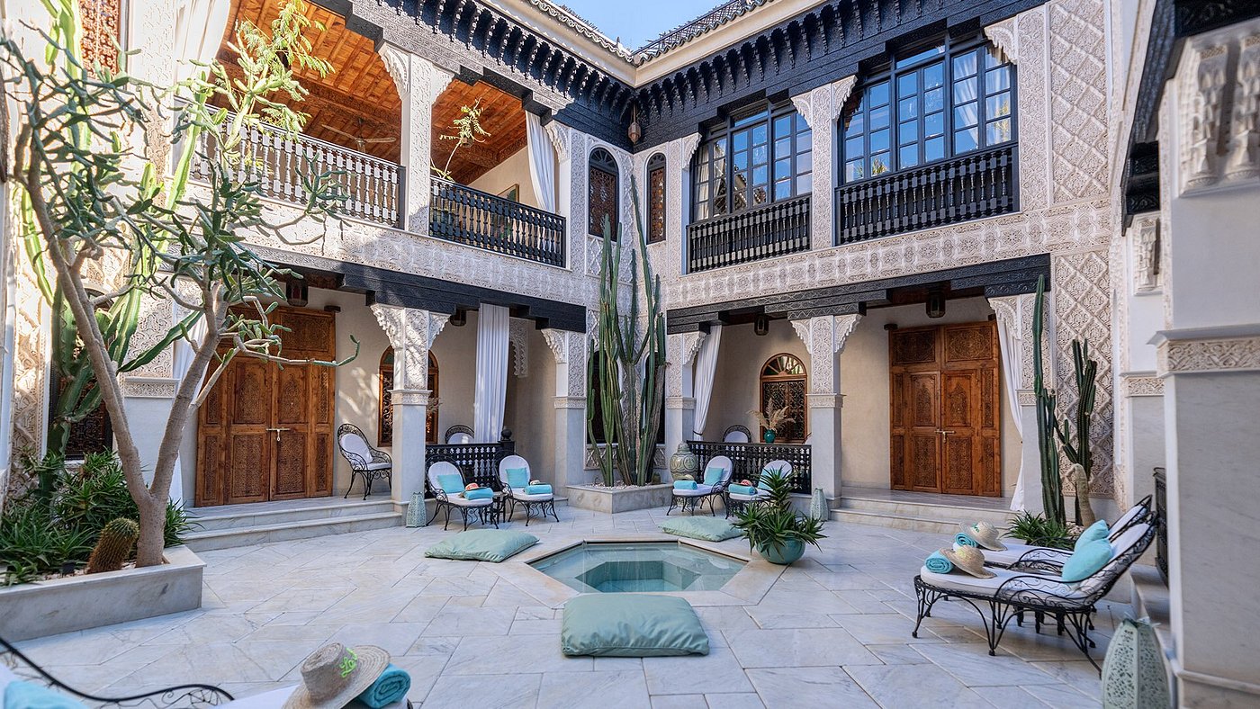 With just 28 rooms and suites, this boutique riad-palace is a labyrinth of marble courtyards, carved cedar ceilings, and rose-scented air.