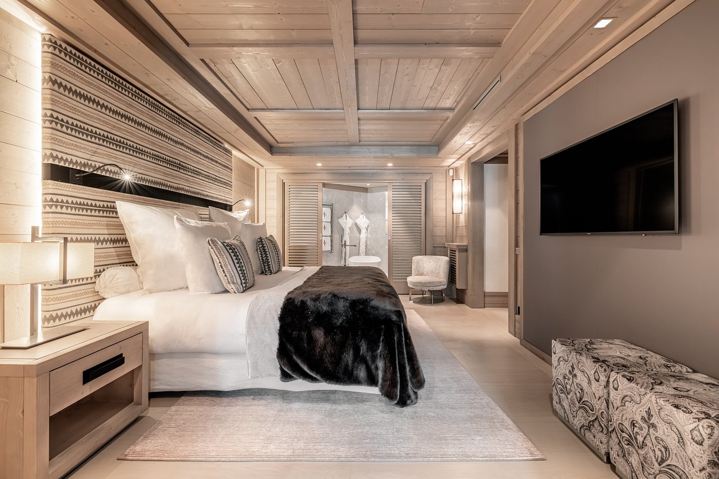 Carved wood, stone, and fur accents meet crystal chandeliers and panoramic terraces—a rare blend of rustic warmth and modern opulence at the summit of the French Alps.