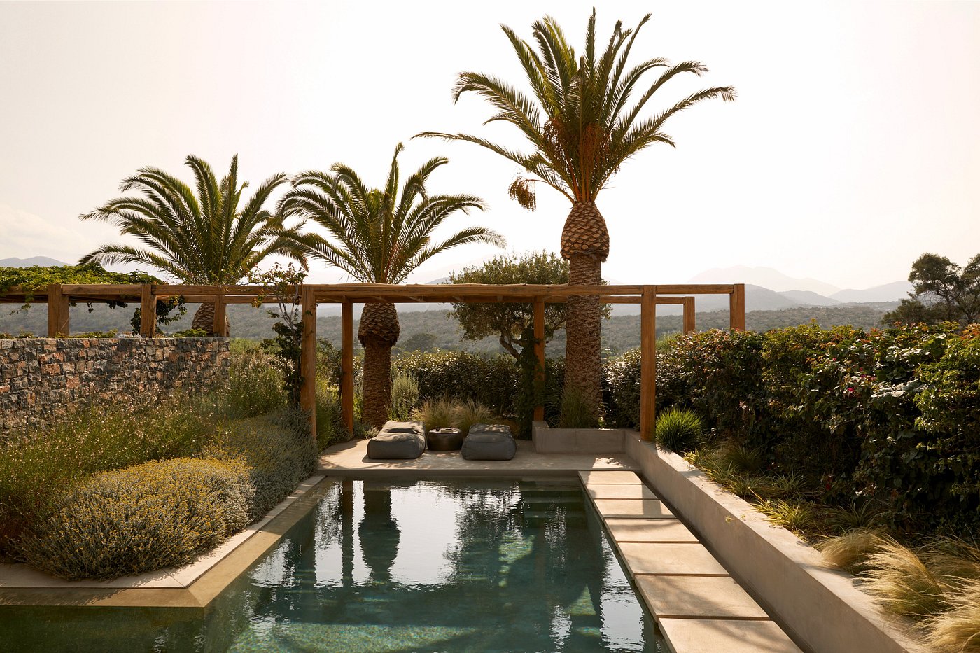 Barefoot to breakfast: still-warm bread, thick yogurt ribbed with thyme honey, figs and tomatoes tasting of sun. Light slides across Mirabello and the infinity pool holds it like glass; you float and watch fishing boats stitch quiet lines across the bay.