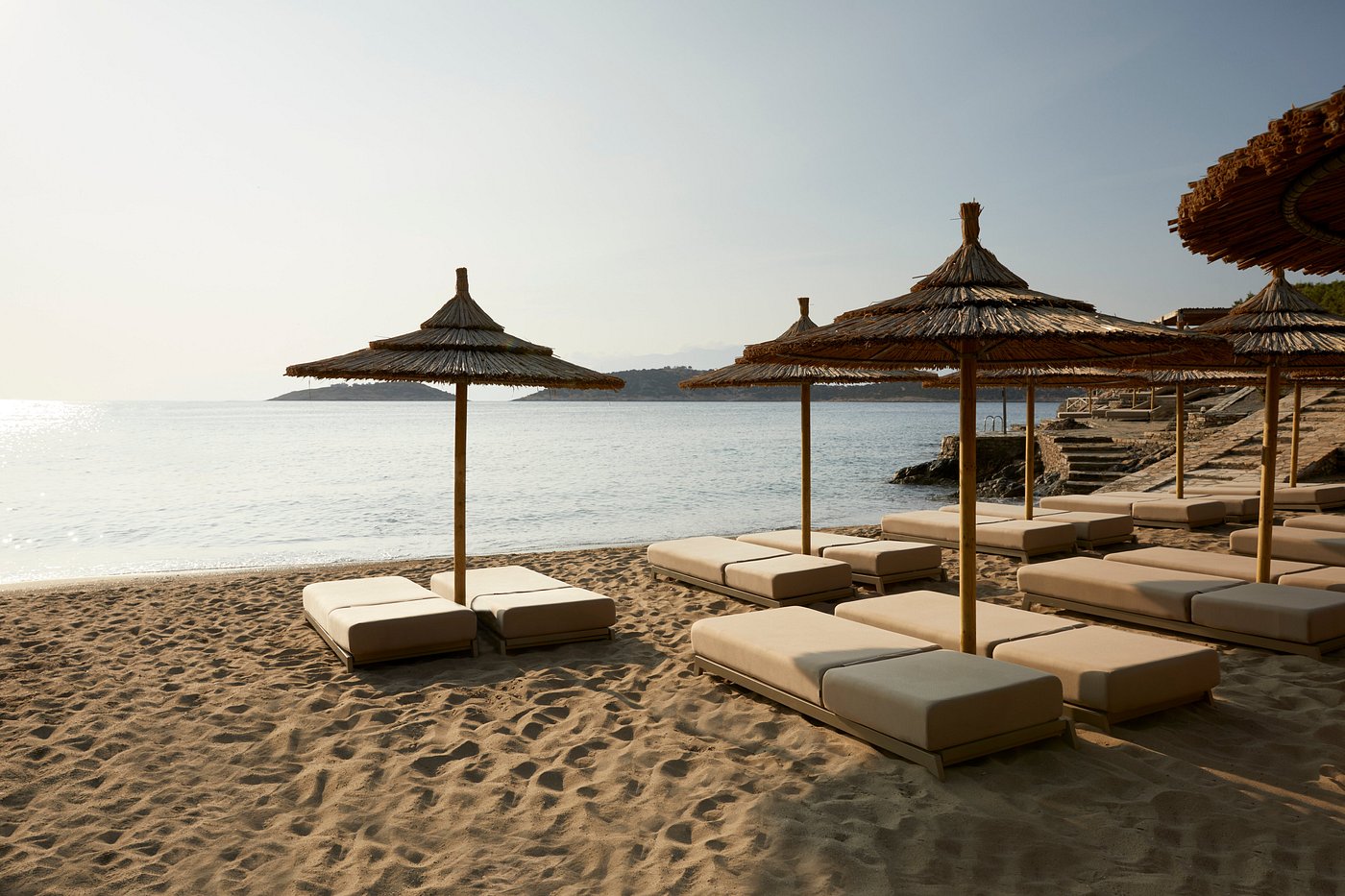White stone, warm wood, and sand-toned textiles keep the focus on the Aegean’s shifting blues. It’s the kind of place where you move between coves, terraces, and long, salt-slow afternoons.