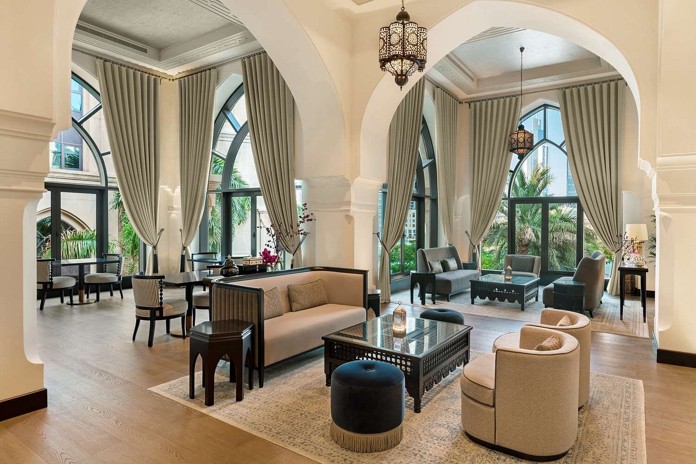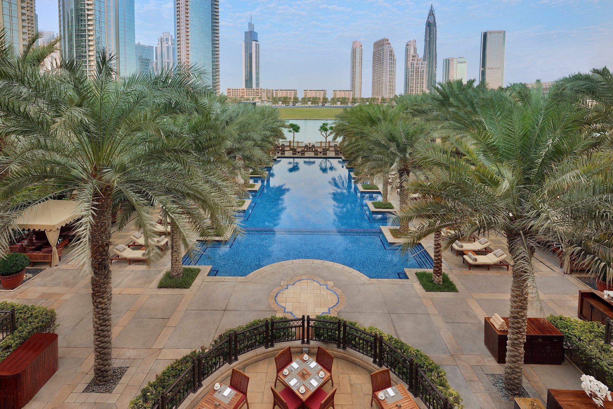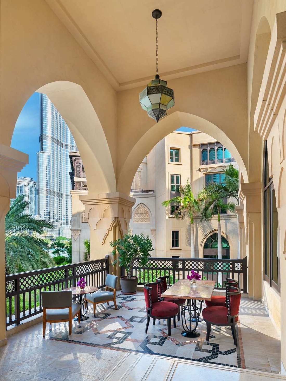 Palm gardens soften the skyline, and the atmosphere shifts gently between quiet intimacy and the dramatic energy of Downtown Dubai just steps away.