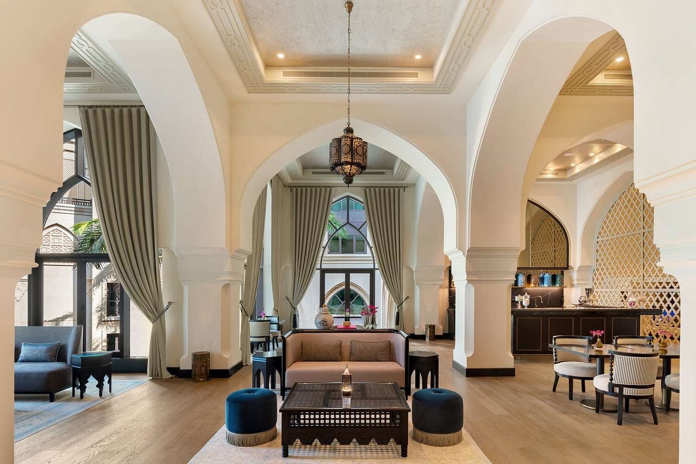 With 242 rooms and suites, this historical-style urban resort blends sand-toned arches, mashrabiya screens, shaded courtyards, and lantern-lit pathways.