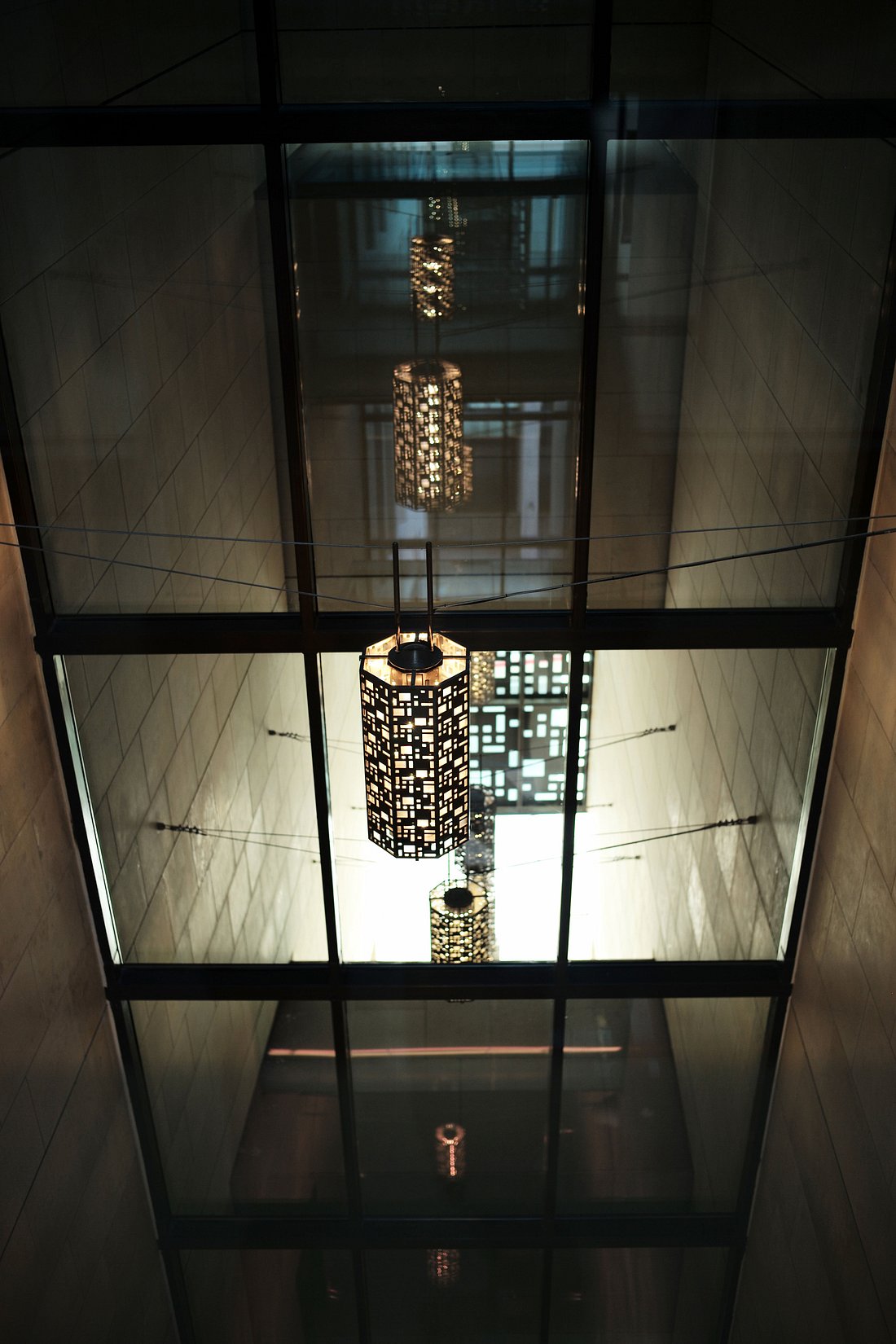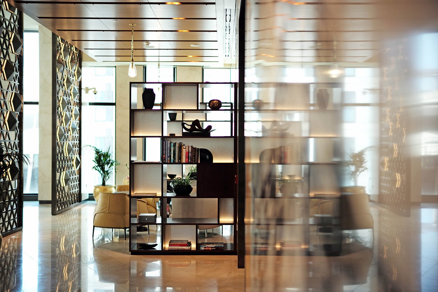 Sunlight filters through geometric screens, marble surfaces glow warm at dusk, and the atmosphere feels serene—a measured contrast to the vibrant district just outside.