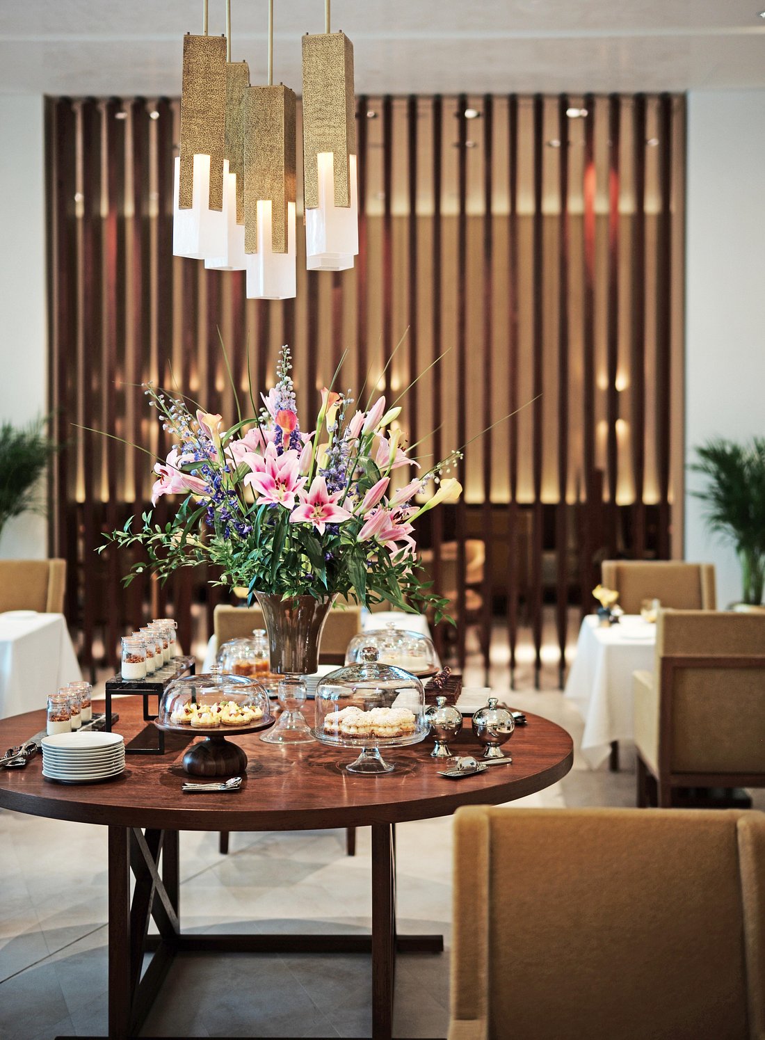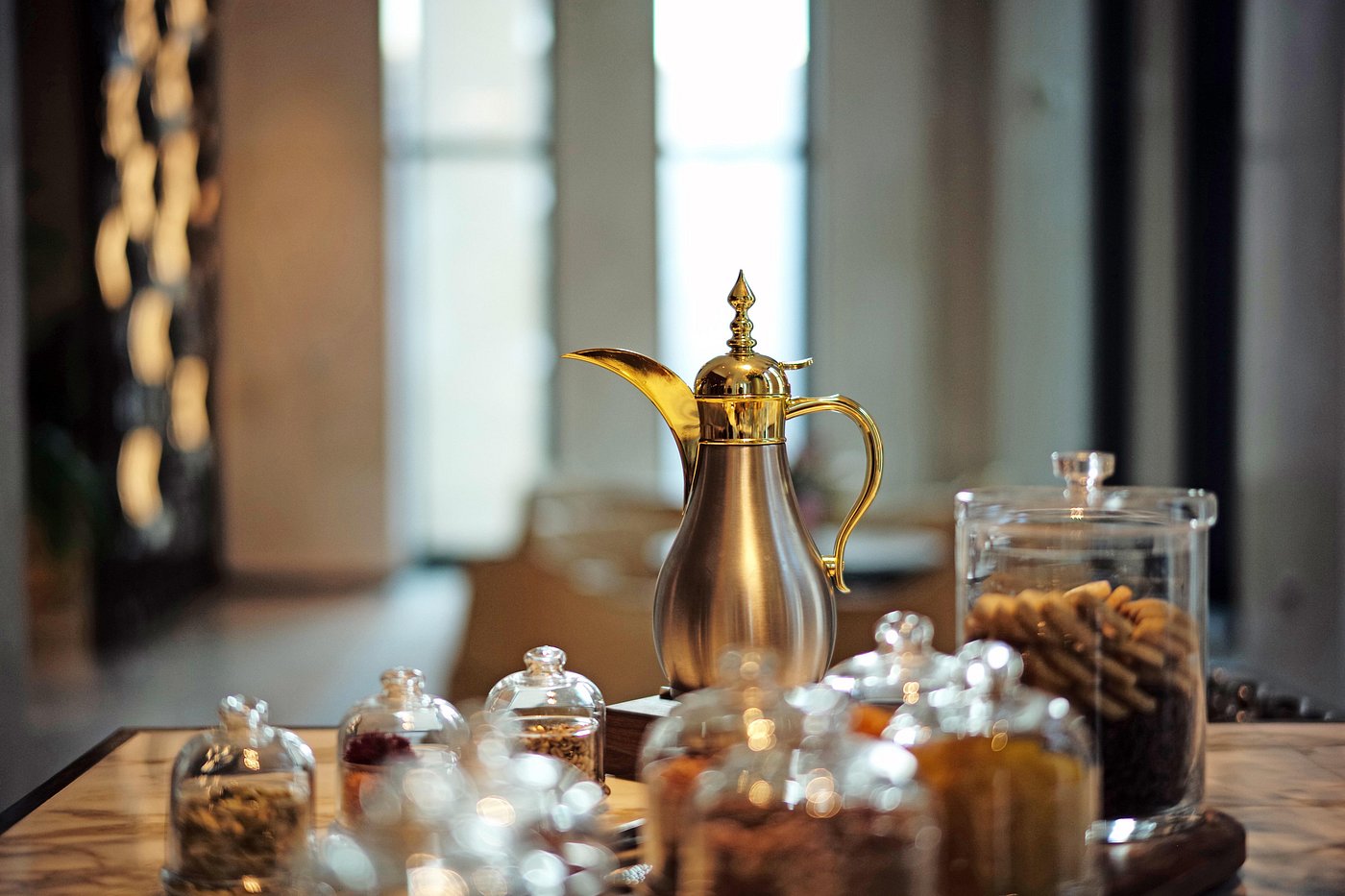 Breakfast by tall windows as the Msheireb district eases into the day.