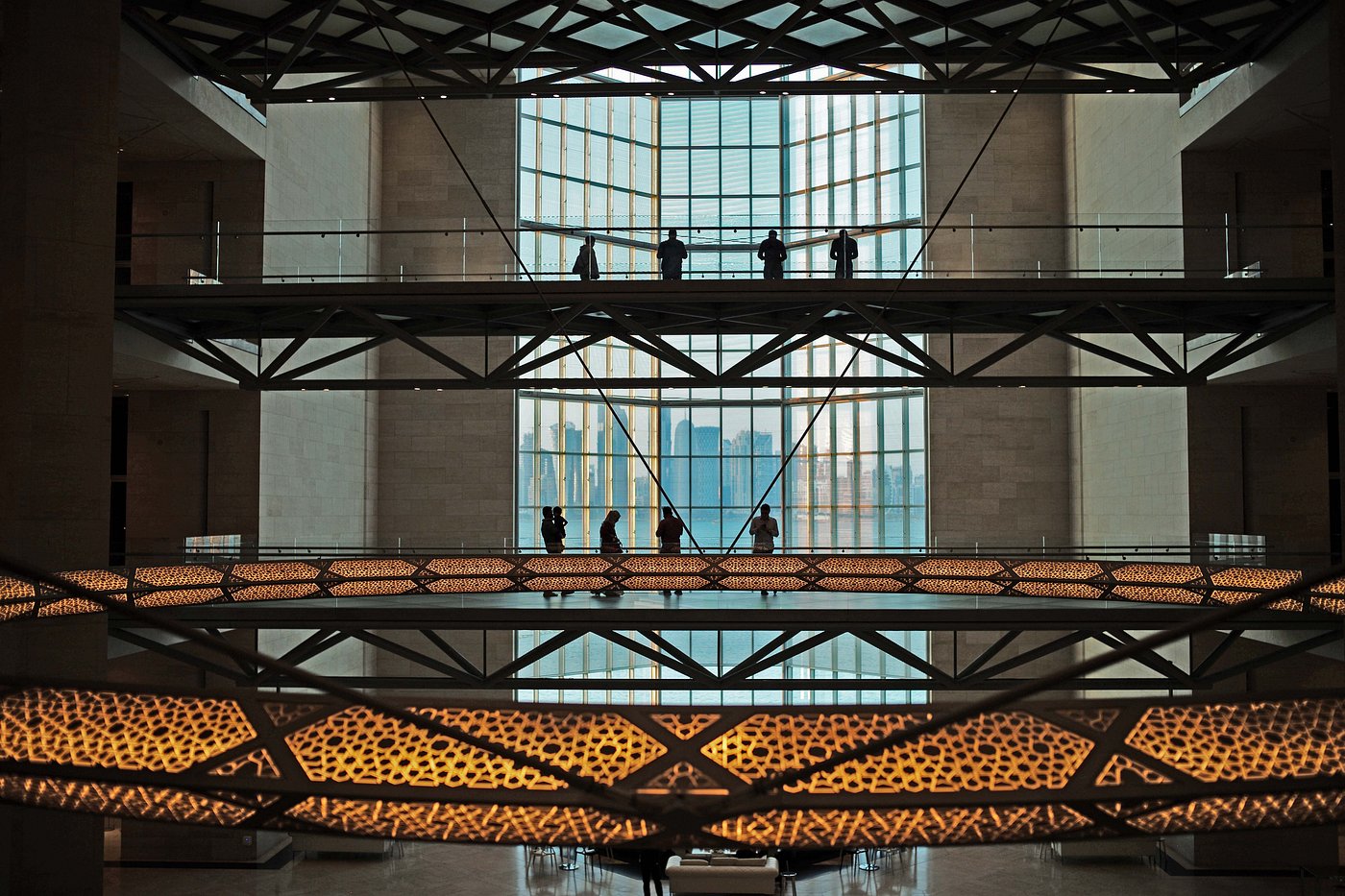 A quiet drink in the lounge—Doha’s skyline glowing softly through the glass.