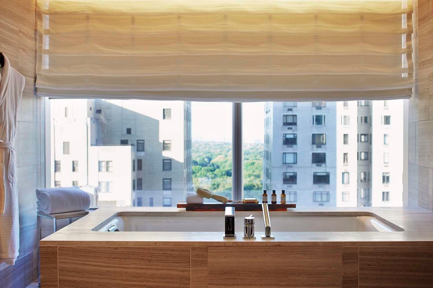 Morning light arrives softly, filtered through tall windows and pale stone surfaces. The room feels hushed, insulated from the city below. A short walk leads into Central Park, where early joggers and dog walkers move through cool air and tree-lined paths. Returning, the hotel remains calm, as if untouched by the morning rush.