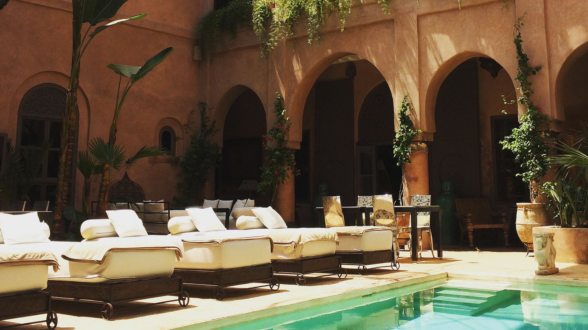 Cool off in the courtyard pool or retreat to the hammam, where rose-scented steam and black soap rituals soothe the senses. Later, explore the nearby souks, the hum of artisans and spices pulling you through winding alleys.