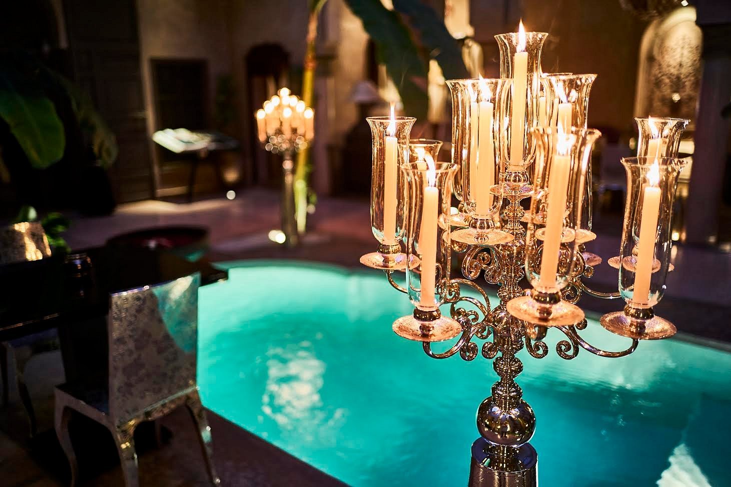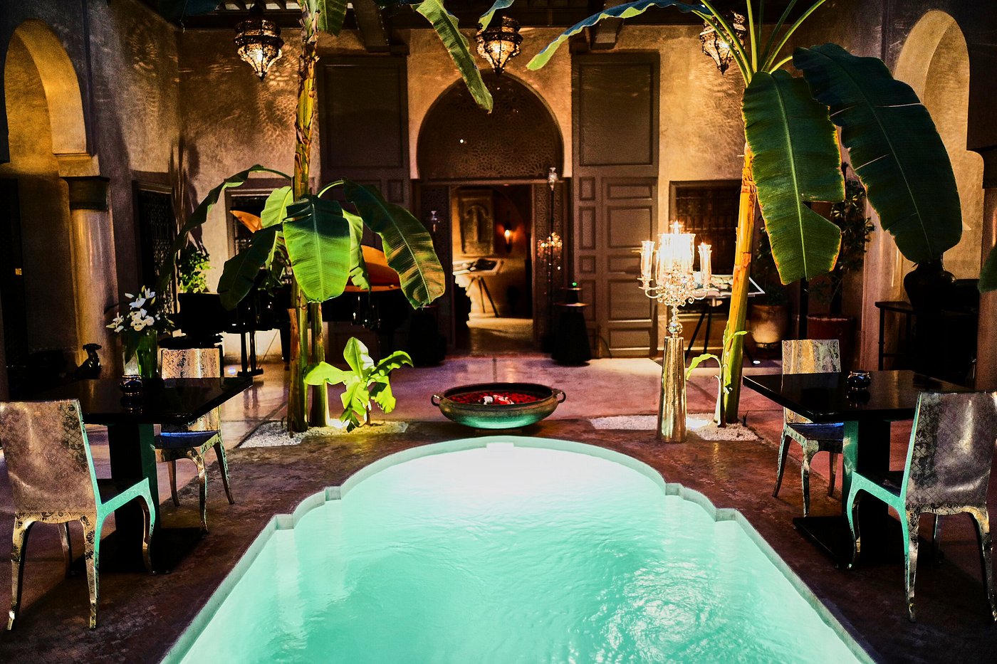 Each corner tells a story: antique doors from Fez, soft tadelakt walls, and flickering lanterns reflected in turquoise pools. The riad captures the soul of Morocco—intimate, mysterious, and alive with quiet beauty.