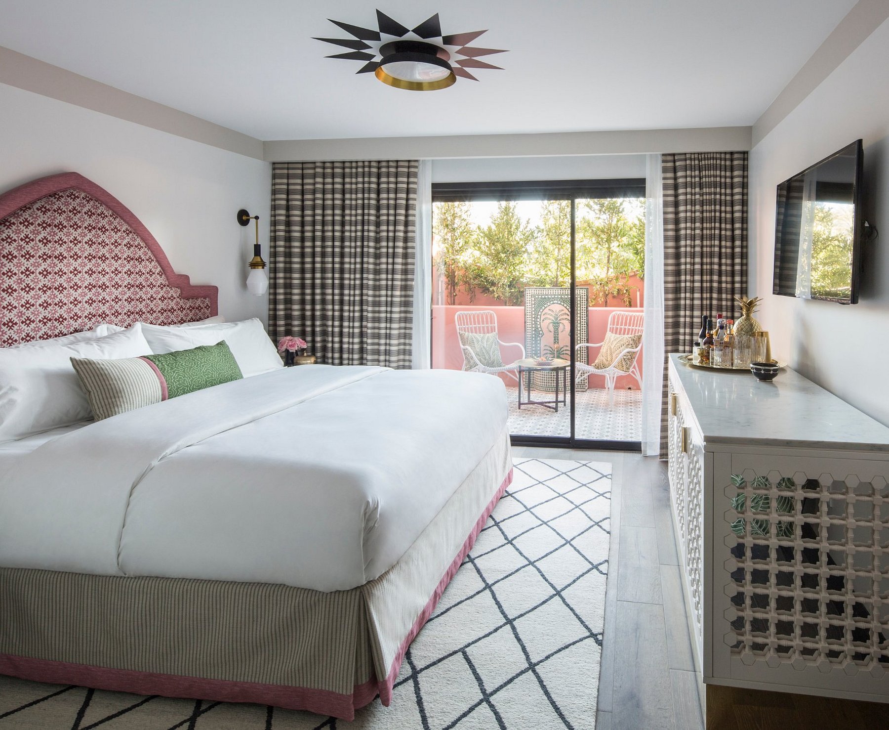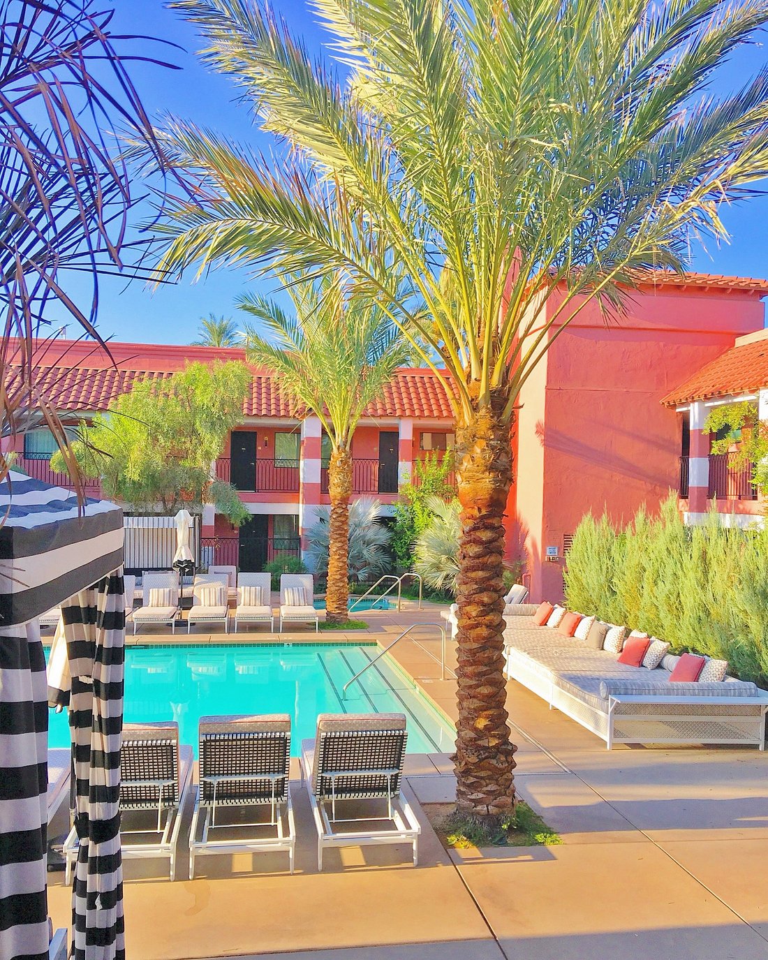 Designed by Martyn Lawrence Bullard, the hotel is a love letter to vintage desert style—lush courtyards, patterned tiles, and rose-colored light that transforms each evening into something magical.