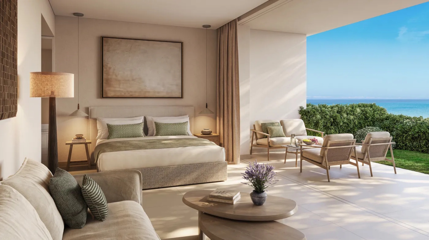 • Suite living—terraces you actually live on, some with gardens that meet the sand.