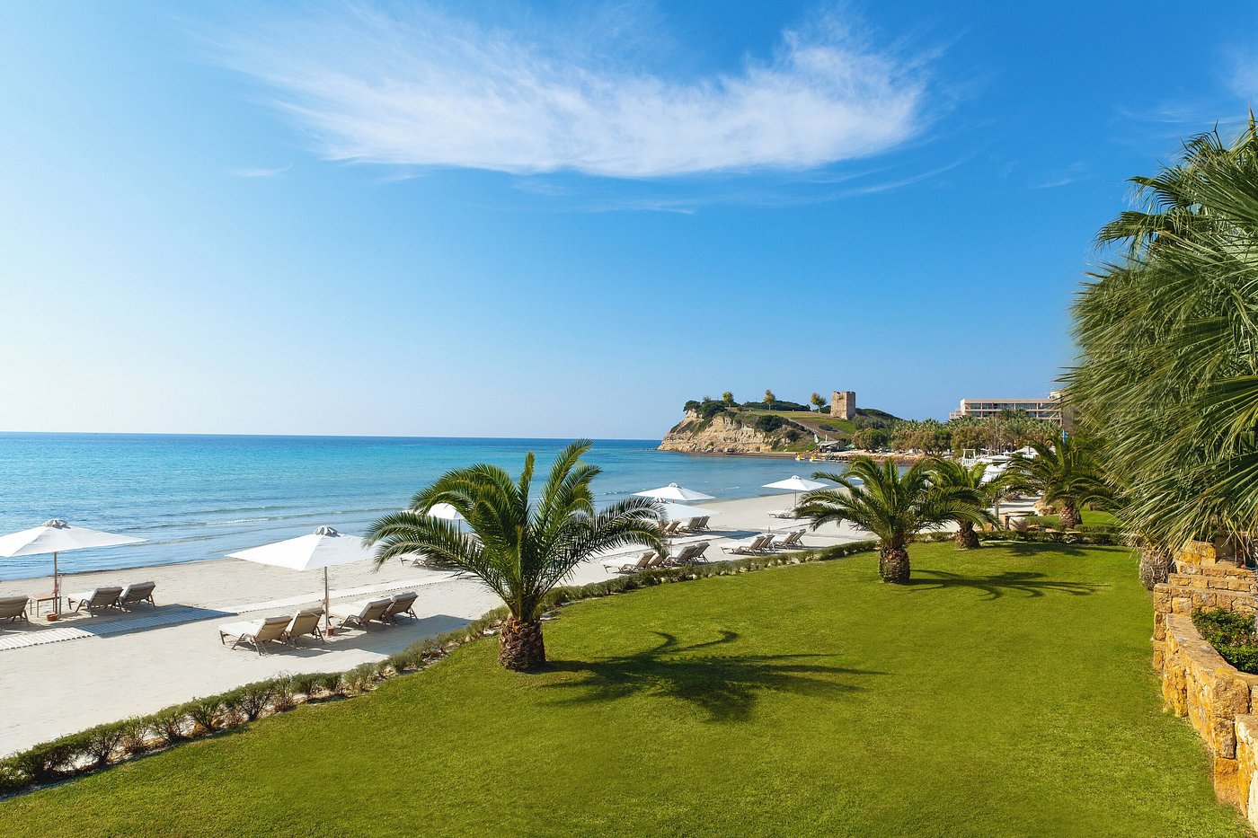 Sani Asterias gathers just 50 suites along a quiet coastal curve—whitewashed lines, soft linen, and terraces that open straight to sea light.