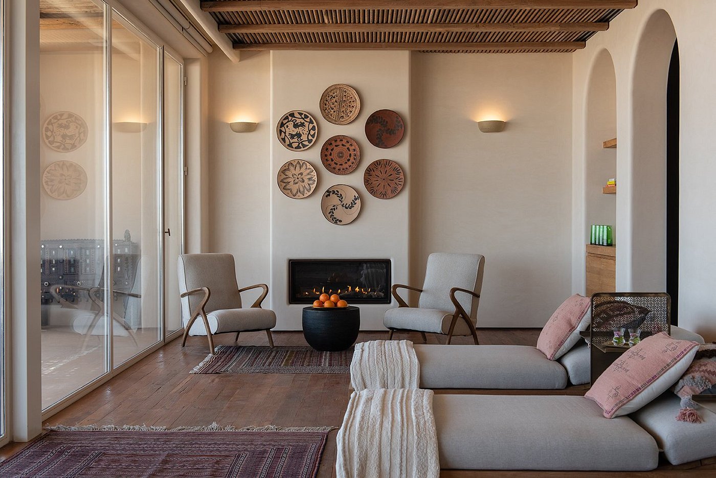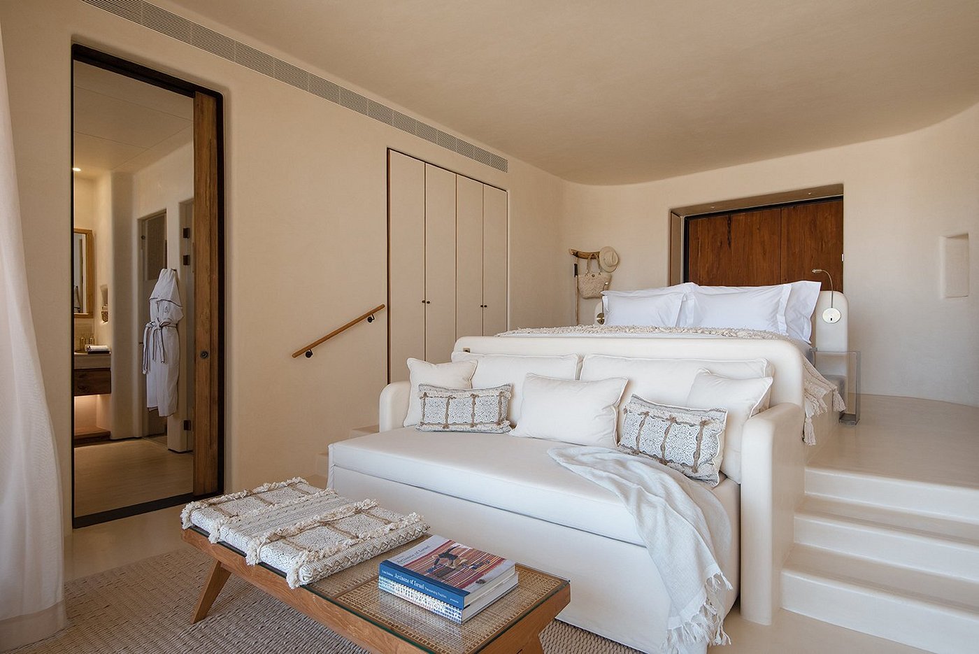 Inside, soft natural textures, handwoven fabrics, and warm desert light create a feeling of grounding calm—a retreat where time slows and the horizon seems endless.