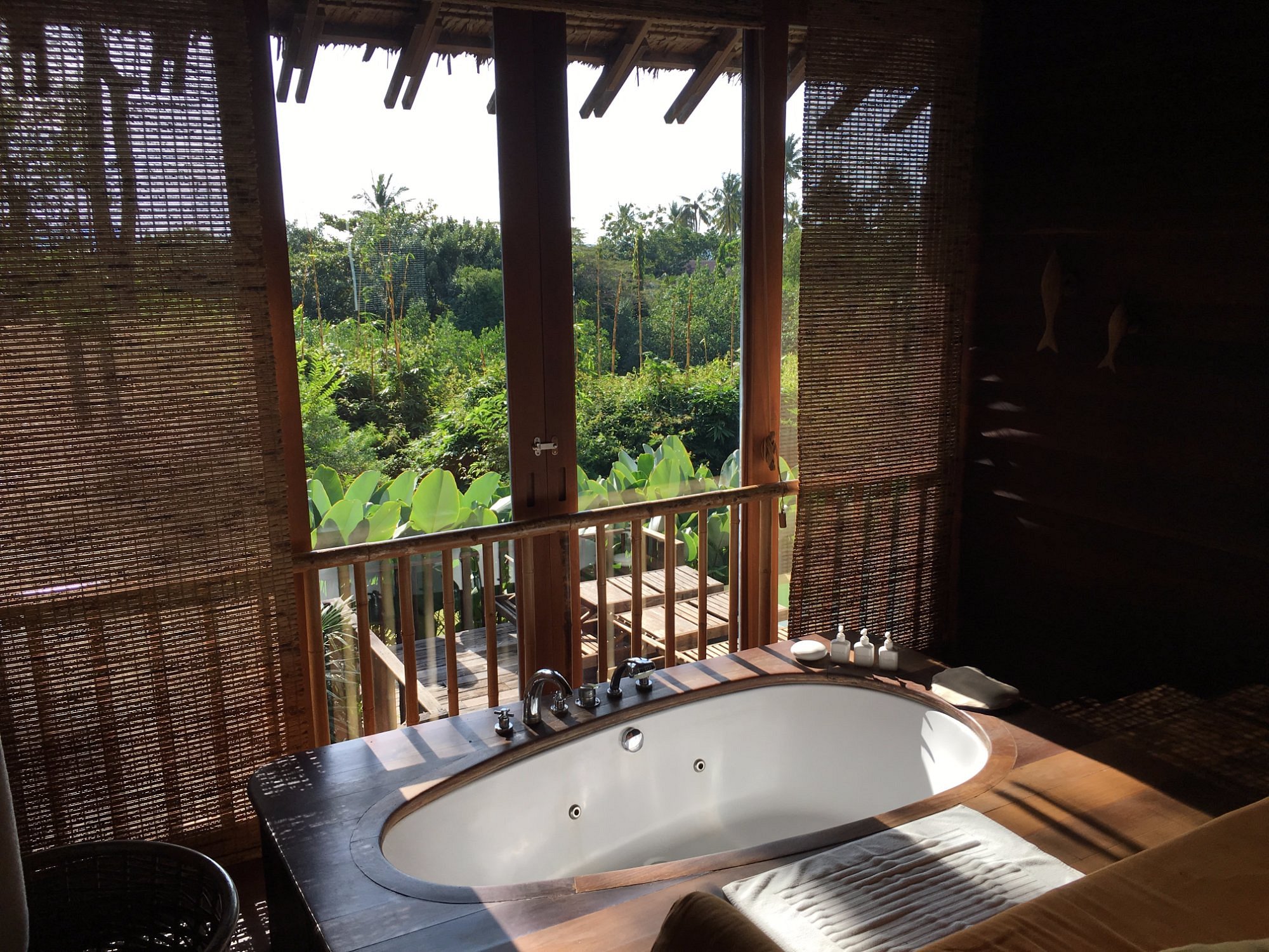 With just 56 villas, each with a private pool, the resort blends handcrafted natural materials with thoughtful design—thatched roofs, bamboo screens, open-air salas, and views that seem to drift endlessly across the bay.