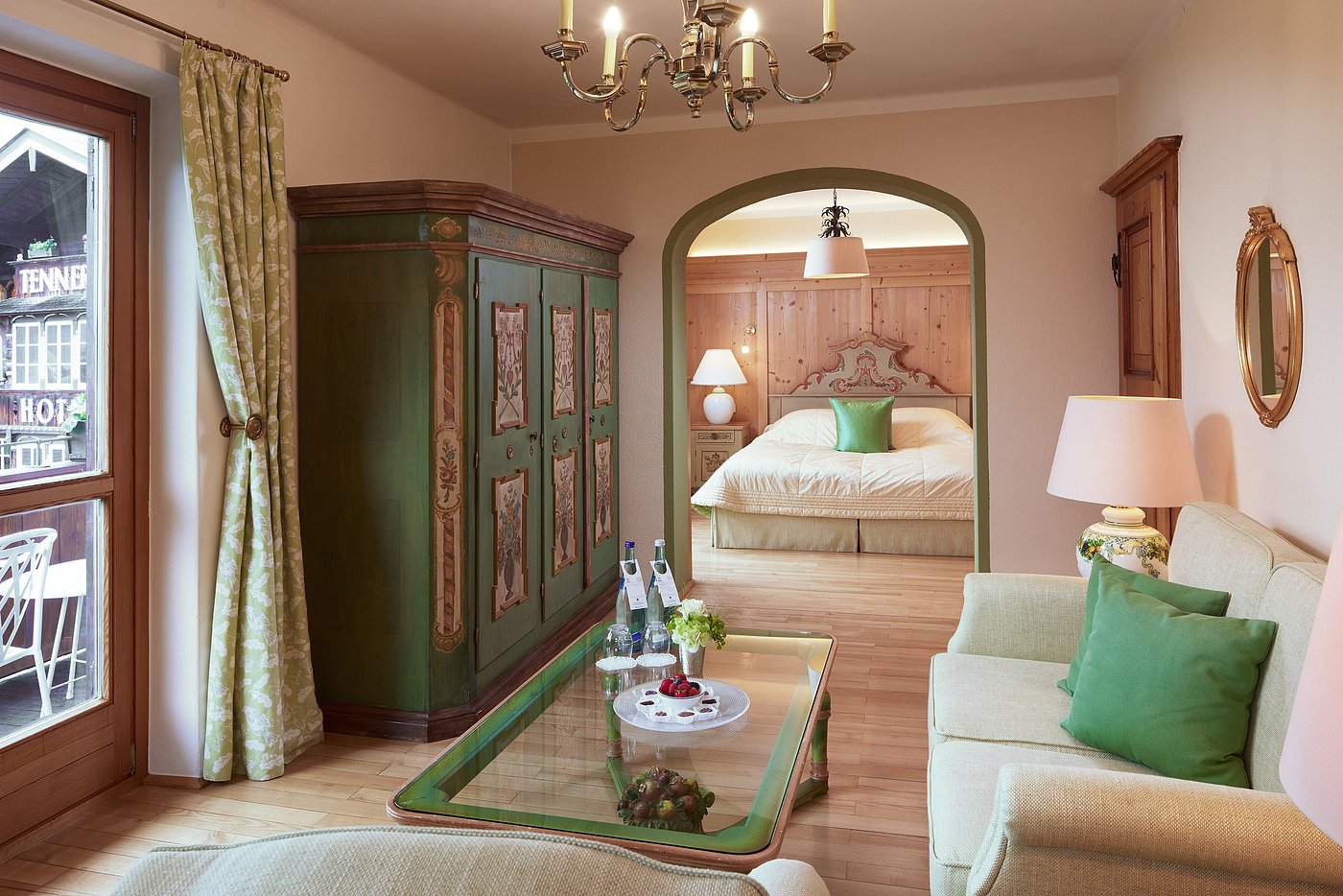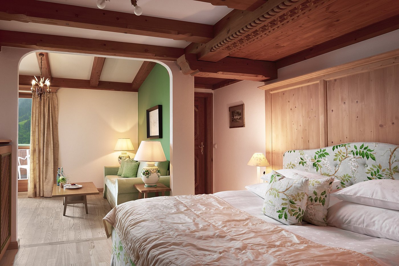 Your room glows softly with traditional Alpine warmth — a peaceful cocoon above the valley.