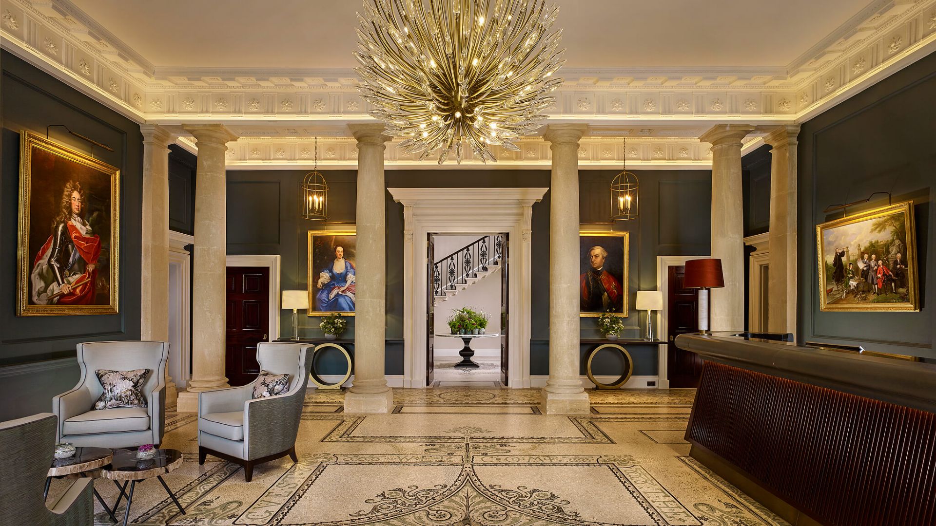 Marble, carved wood, sweeping staircases, and tall sash windows create an atmosphere of heritage elegance, softened by modern comforts and a sense of country calm.