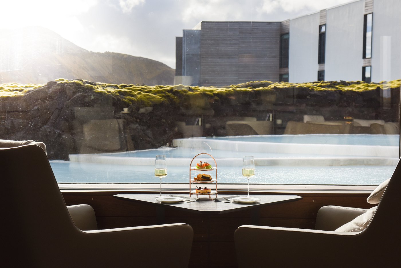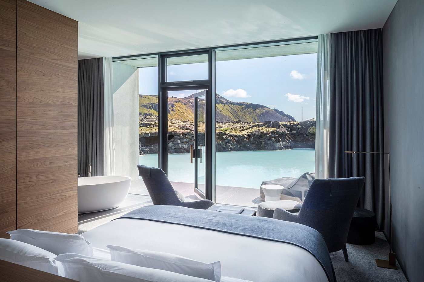 Your suite becomes a cocoon — muted light, raw textures, and the distant glow of geothermal steam outside the glass.