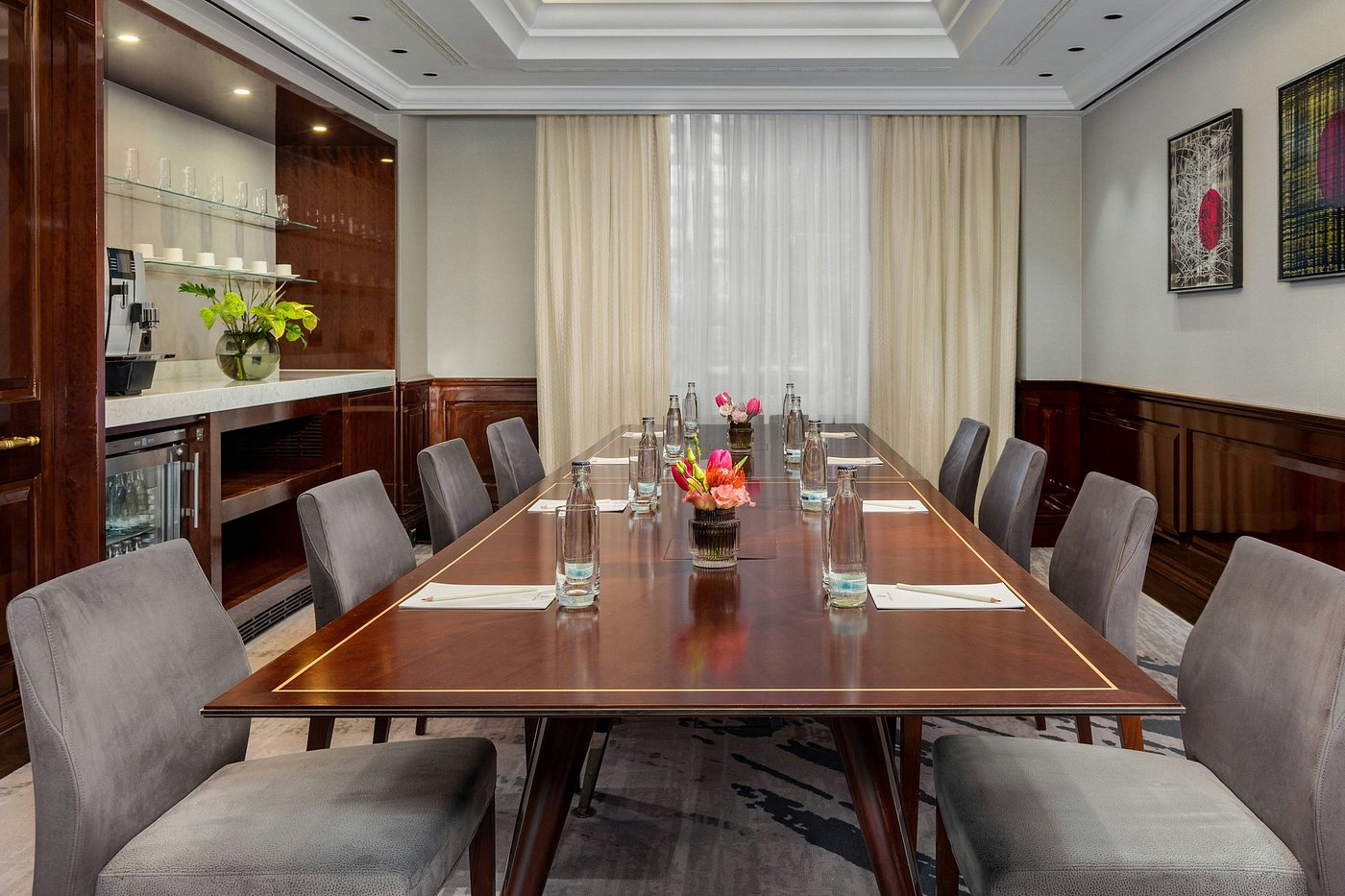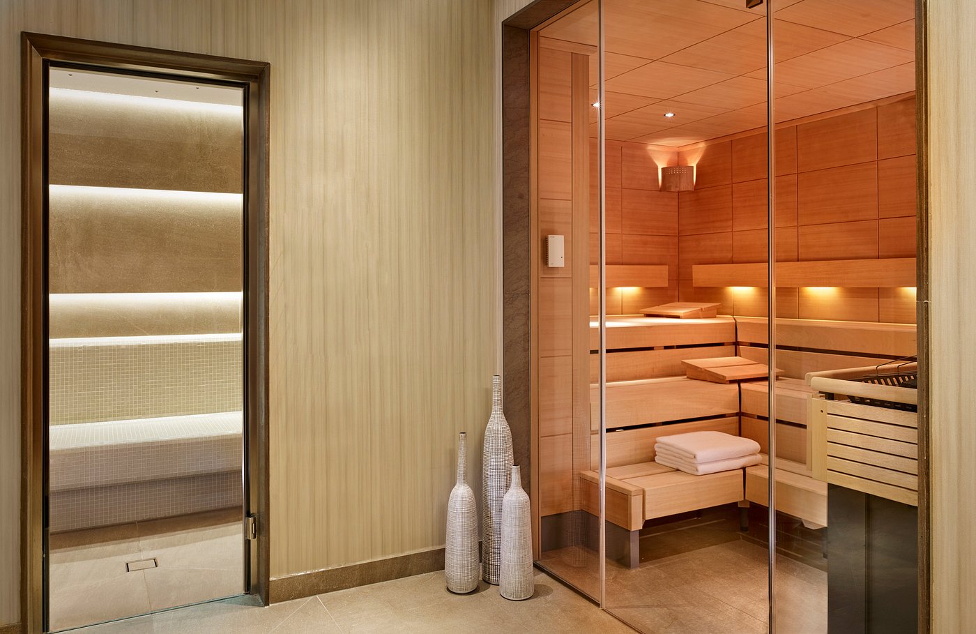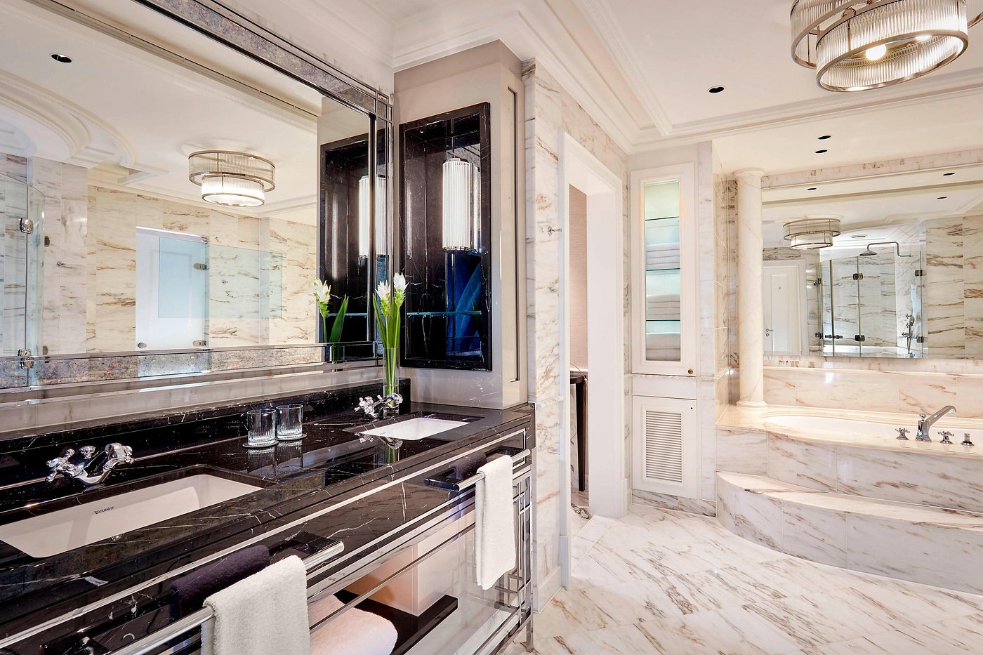 Explore nearby museums or boutiques, then return to the pool and wellness area for a swim or sauna session. In your suite, soft light glows across marble and velvet.
