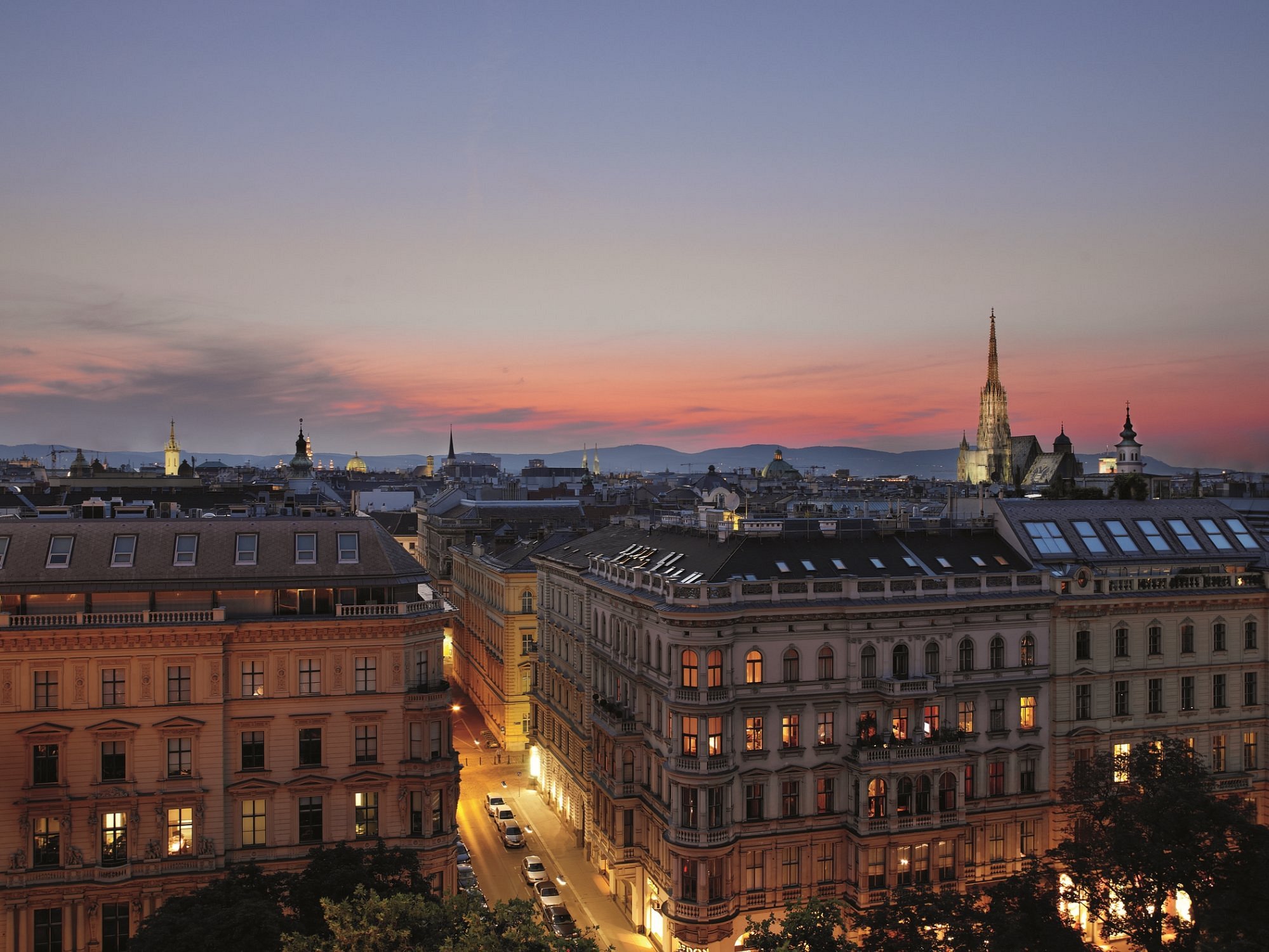 Your room feels opulent yet soothing—thick drapery, soft lighting, and the quiet murmur of Vienna settling into night.
