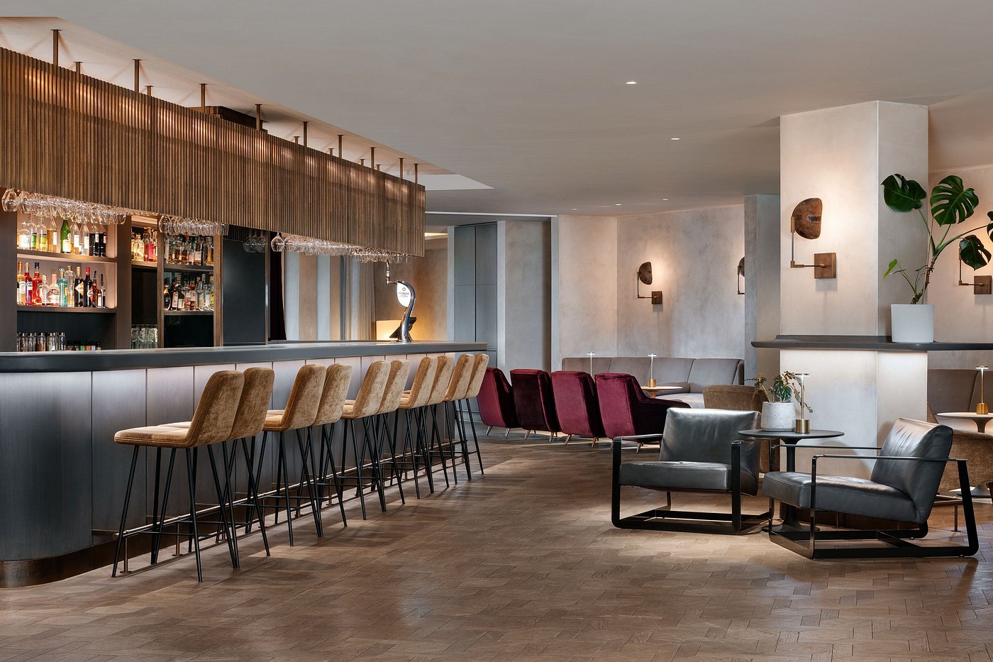 Sip a nightcap in the bar before heading to your room, where soft light, warm textures, and skyline views create a peaceful retreat above the city.
