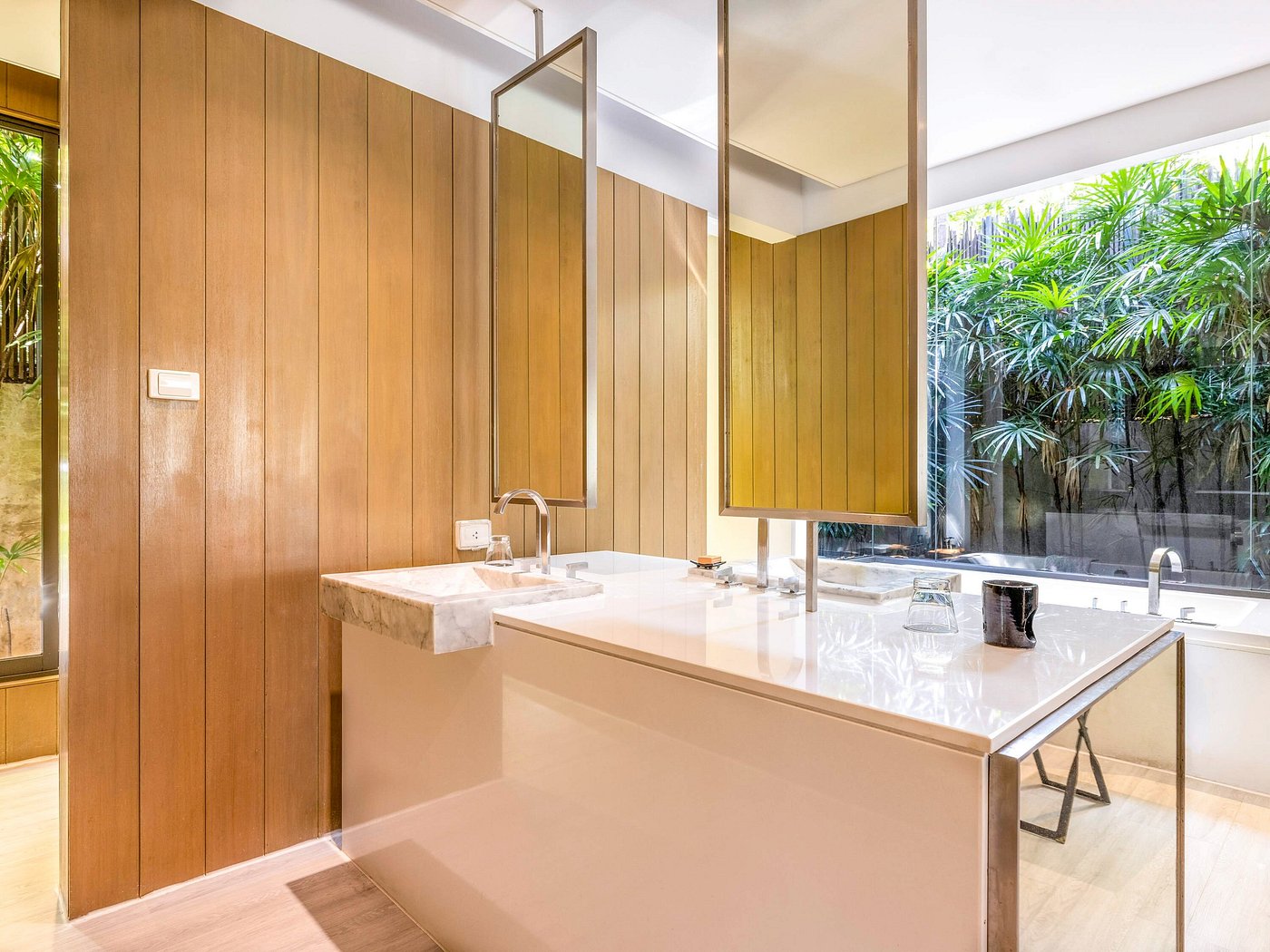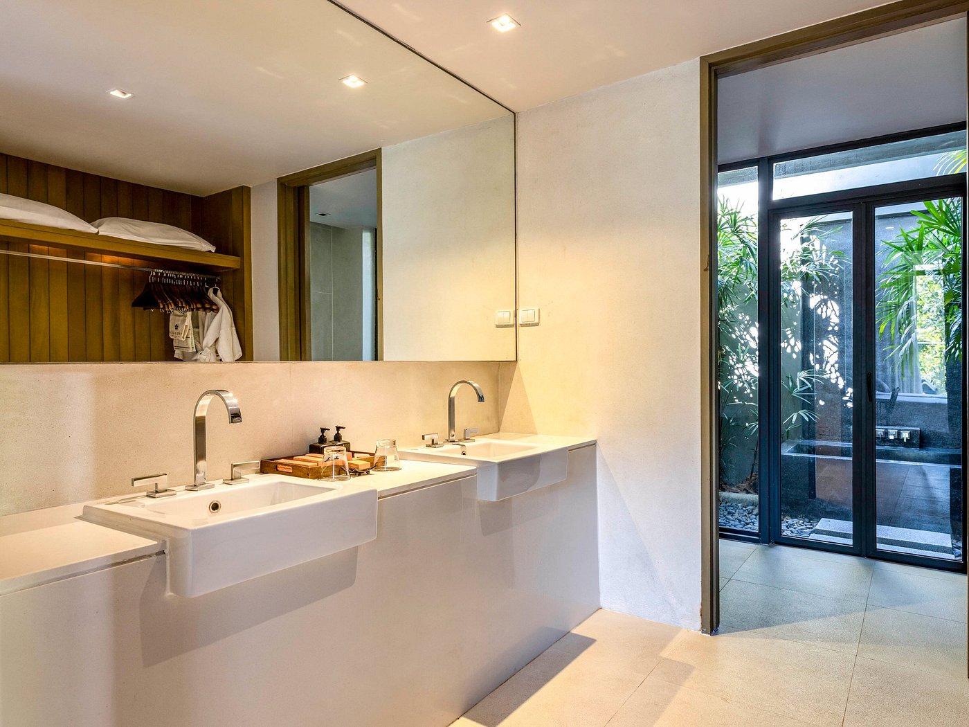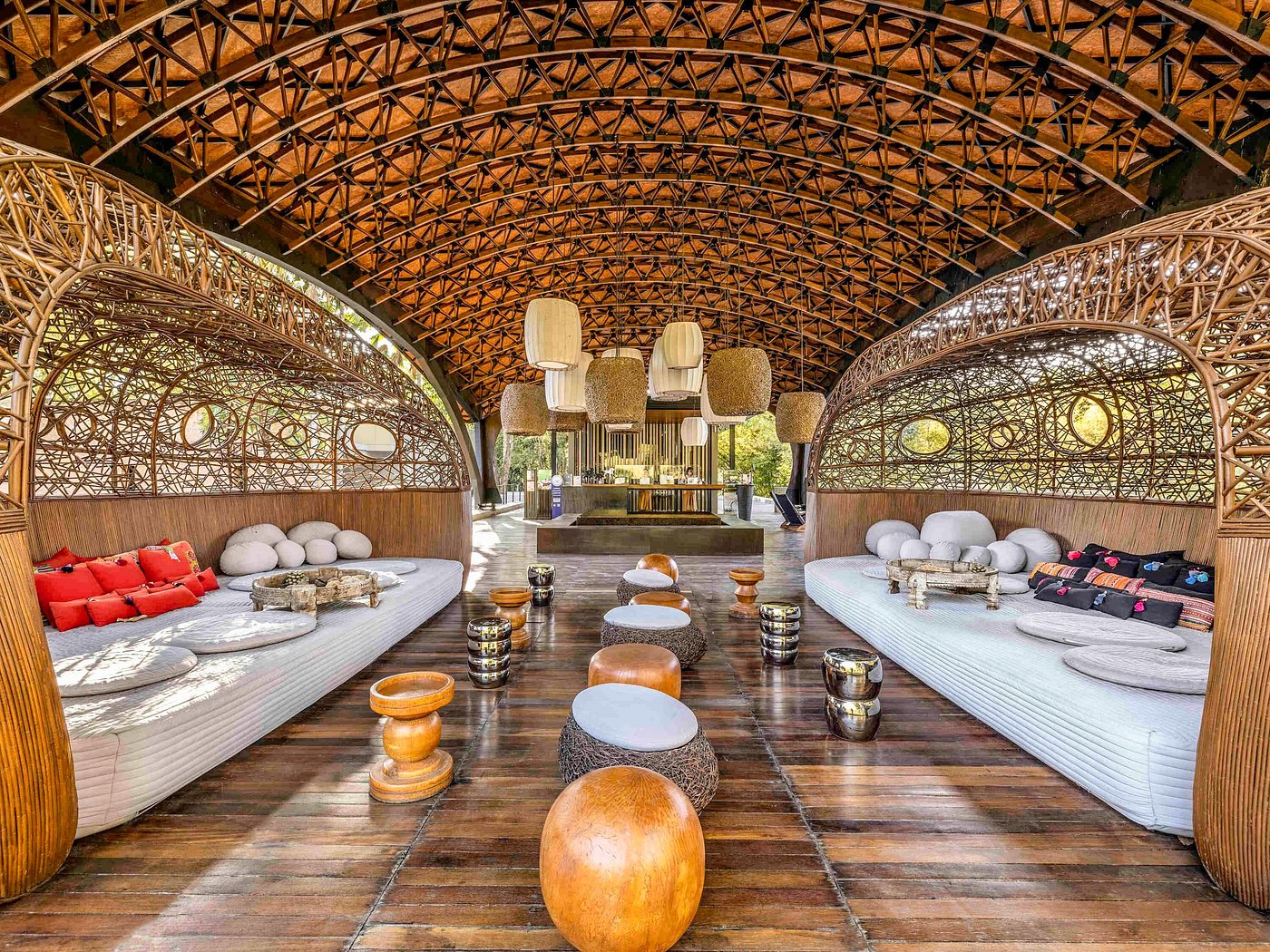 With 71 rooms and villas, the atmosphere feels open and contemplative — stone paths, reflective pools, and views stretching across rice fields and distant peaks.