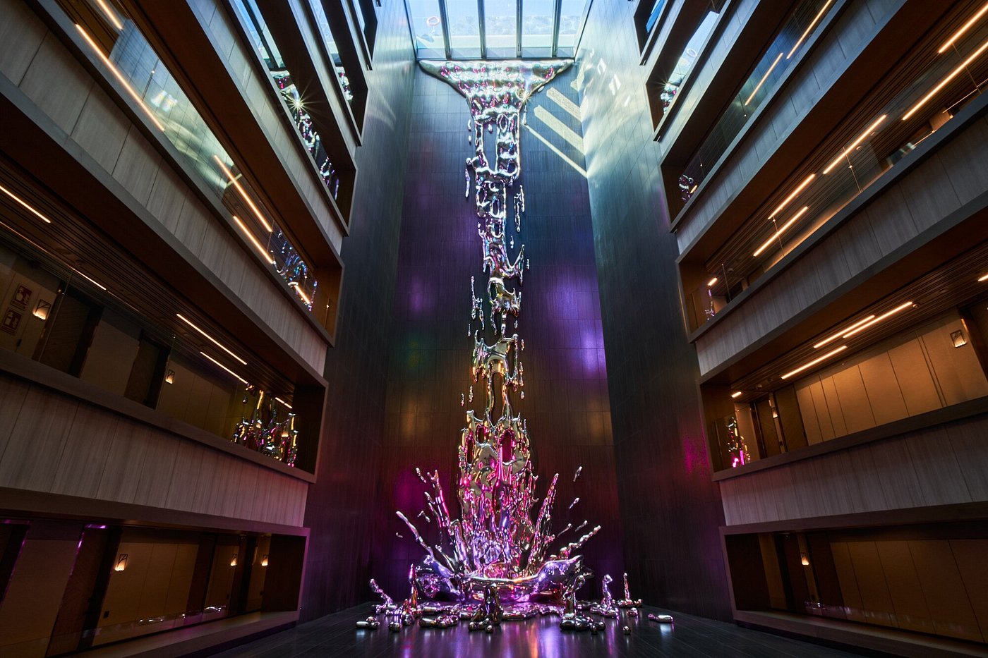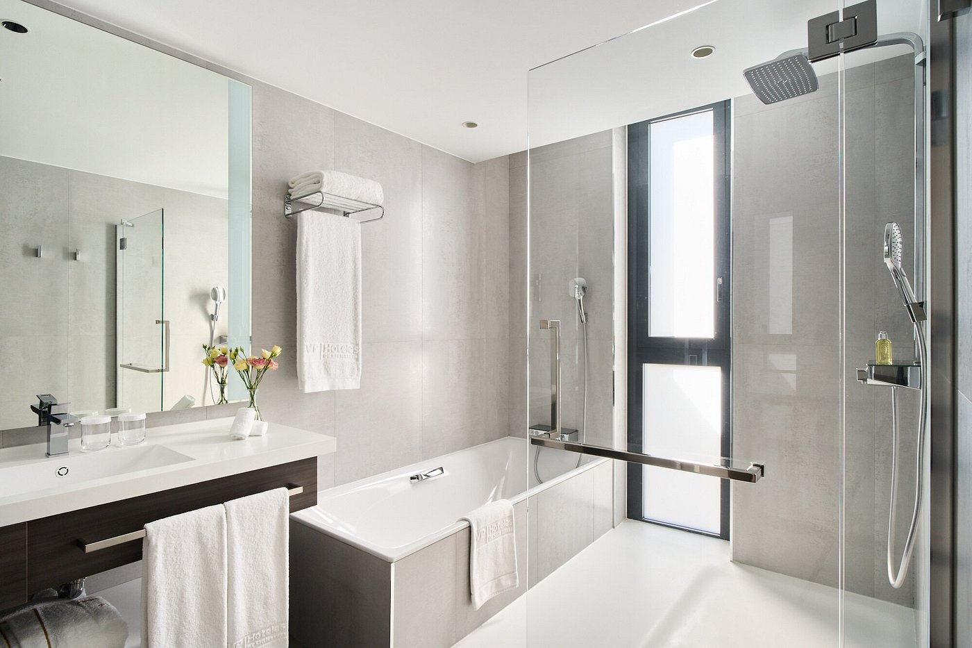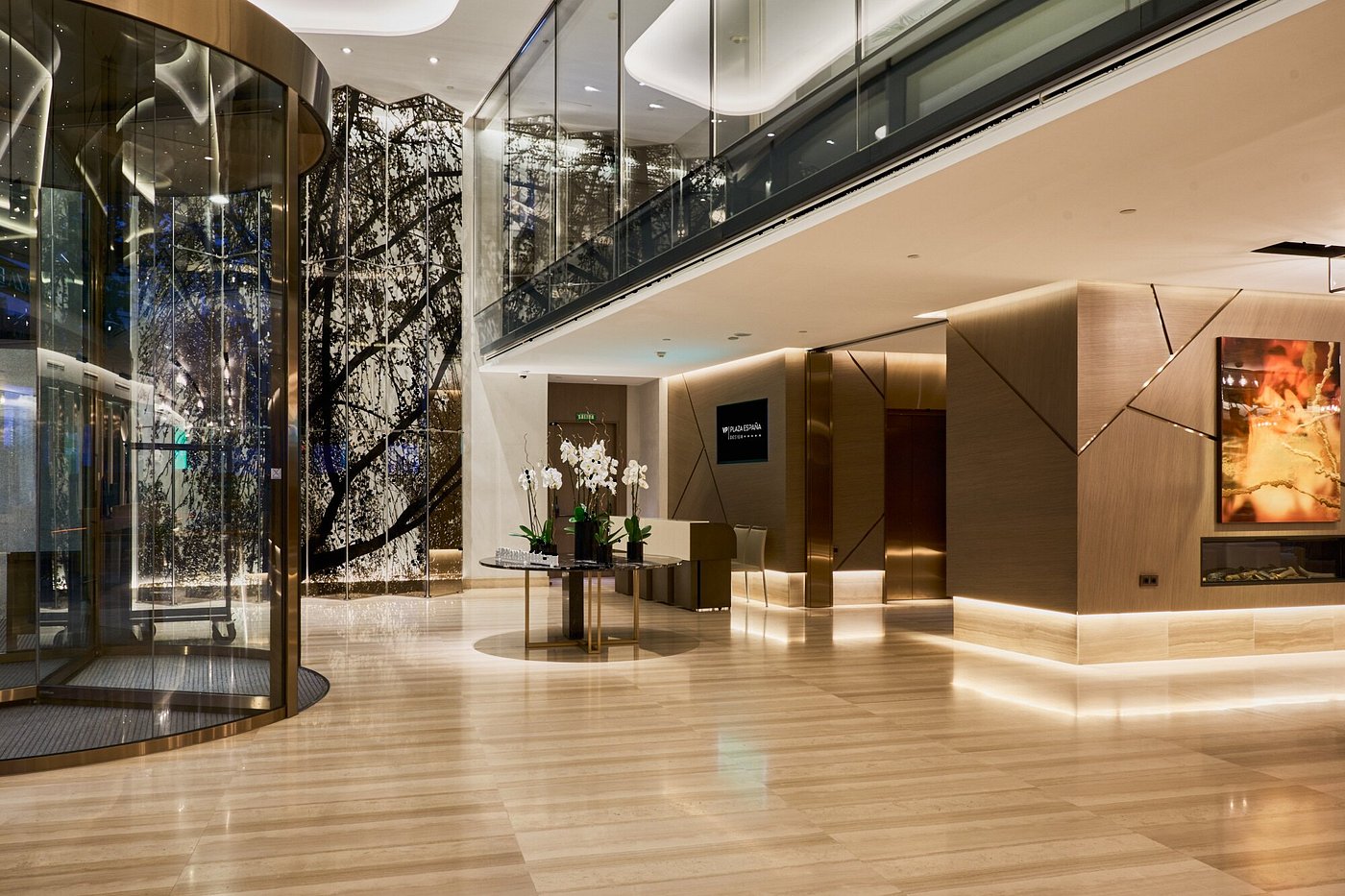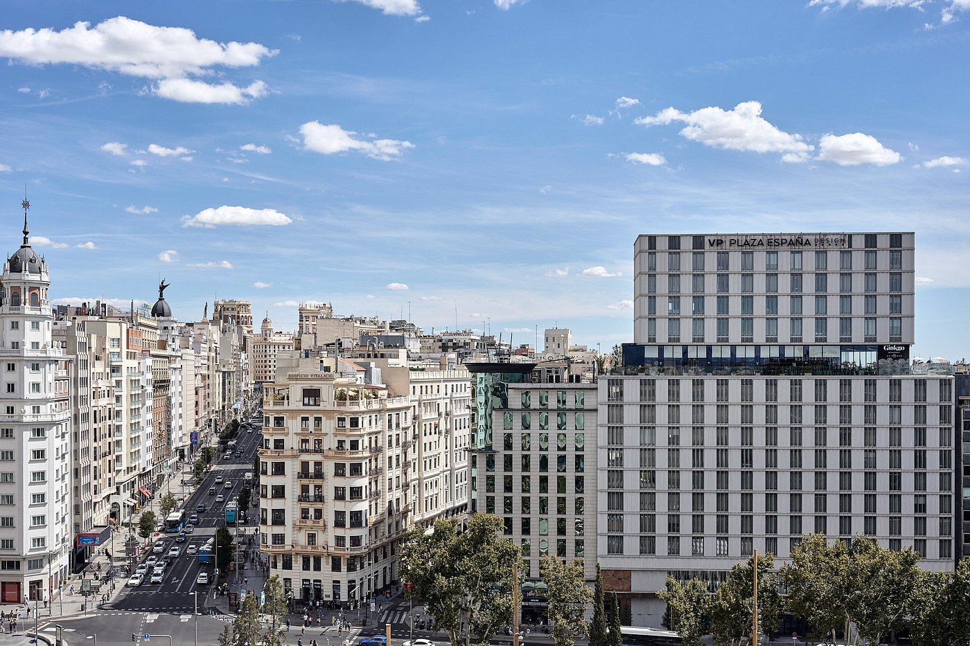 Sunrise slides across Plaza de España and up the glass of VP Plaza España Design. Inside, polished stone and warm wood hush the bustle of Gran Vía below.