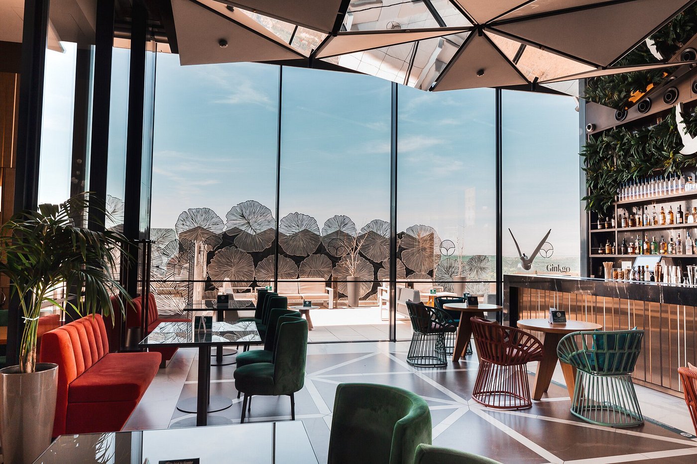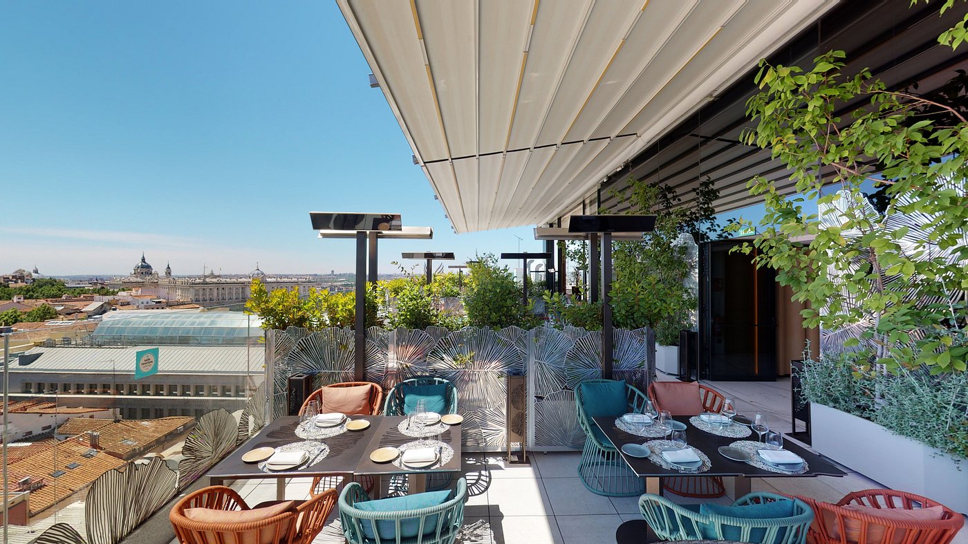 Elevators sigh open onto the rooftop; Madrid spreads out—spires, domes, and sunset copper. You share small plates, clink a vermouth spritz, and watch the lights come on across the city.
