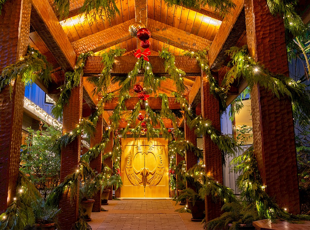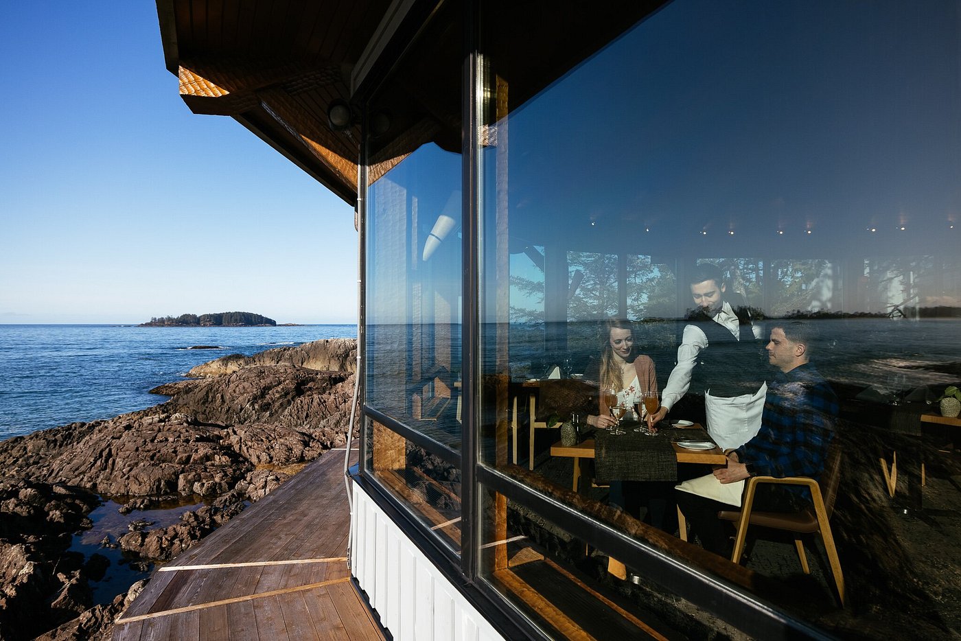 As daylight thins, the water darkens and wind settles. Dinner feels deliberate and warm, shaped by the sense of being held between forest and ocean.