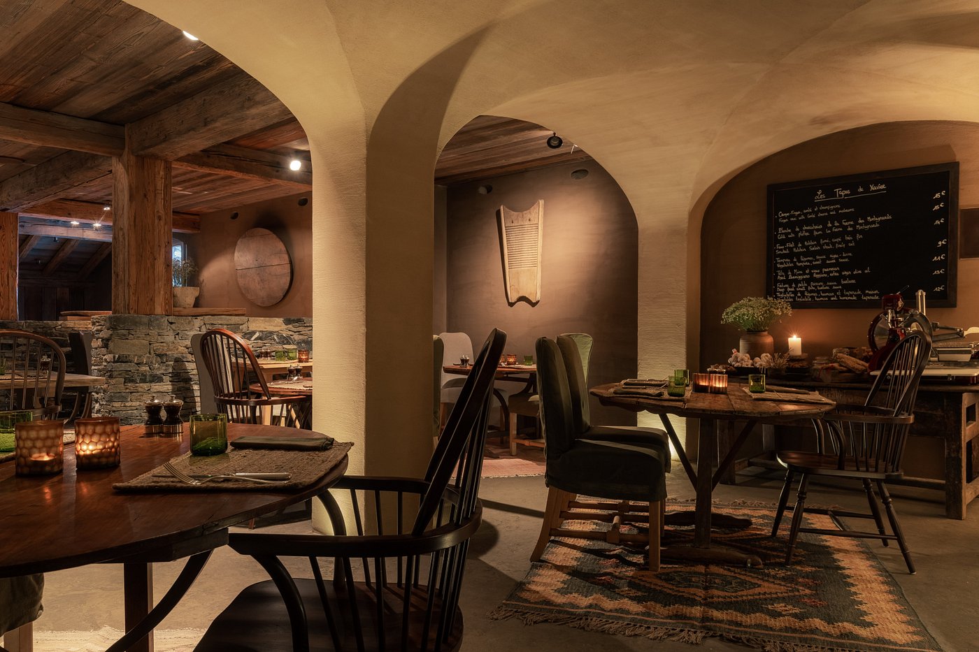 Dinner unfolds in the wood-beamed restaurant, where candles flicker over plates of truffled fondue and roasted vegetables. The scent of pine and butter lingers in the air.